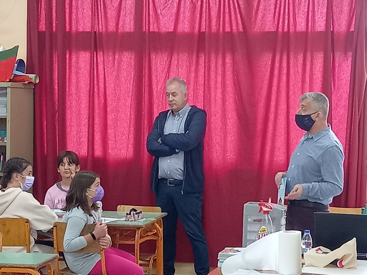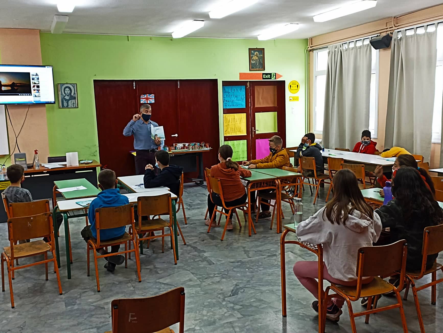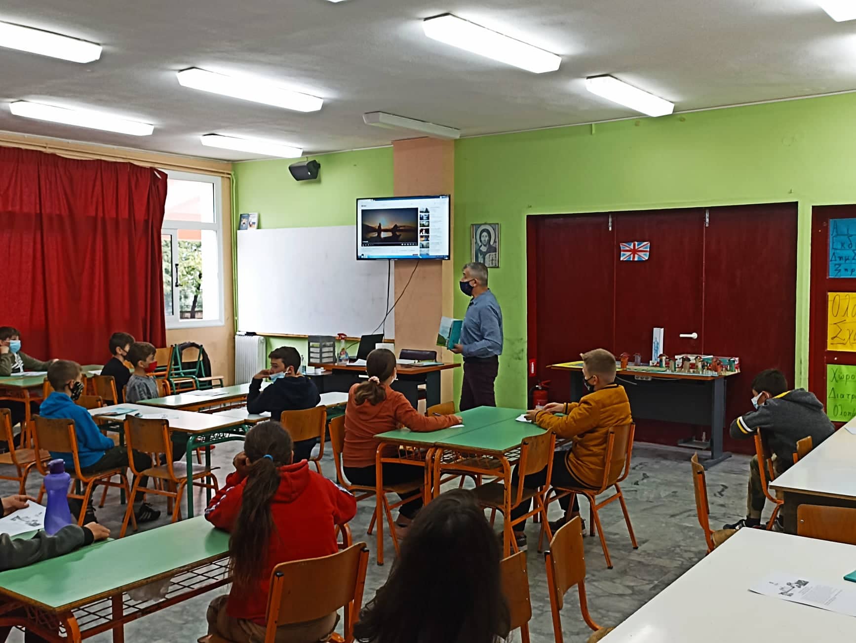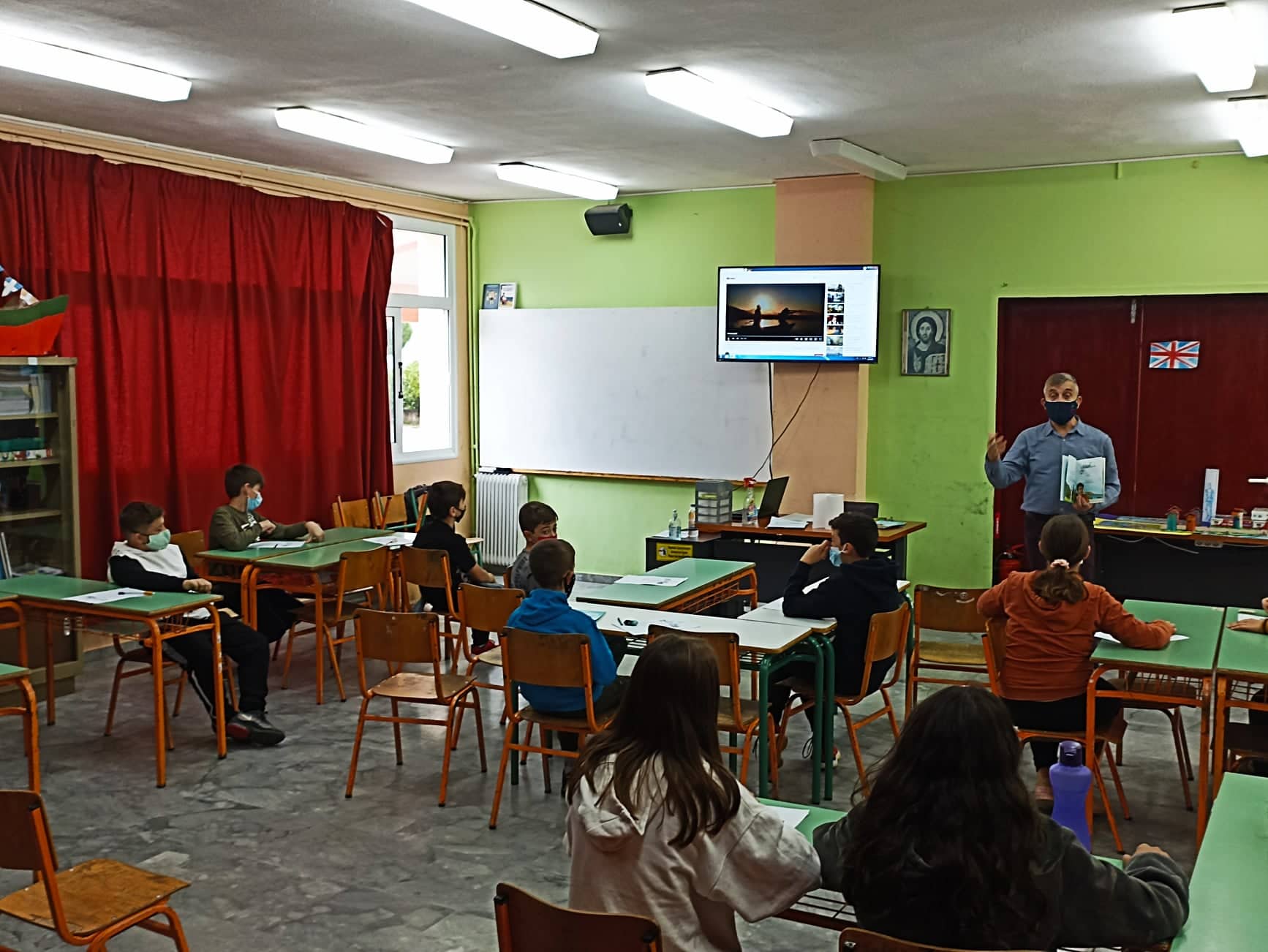 Στο Νηπιαγωγείο Ξηροκαμπίου μίλησε στους μικρούς μαθητές για την αξία της σχολικής αλλά και της οικογενειακής βιβλιοθήκης, ενώ στους μαθητές της Ε΄ και ΣΤ΄ τάξης παρουσίασε το βιβλίο του με τίτλο « Το παιδί με την φουστανέλα» που γράφτηκε με αφορμή την συμπλήρωση των 200 ετών από την Ελληνική Επανάσταση και αναφέρεται στη διαφορετικότητα και το ευαίσθητο θέμα των ανθρώπων με αναπηρίες.