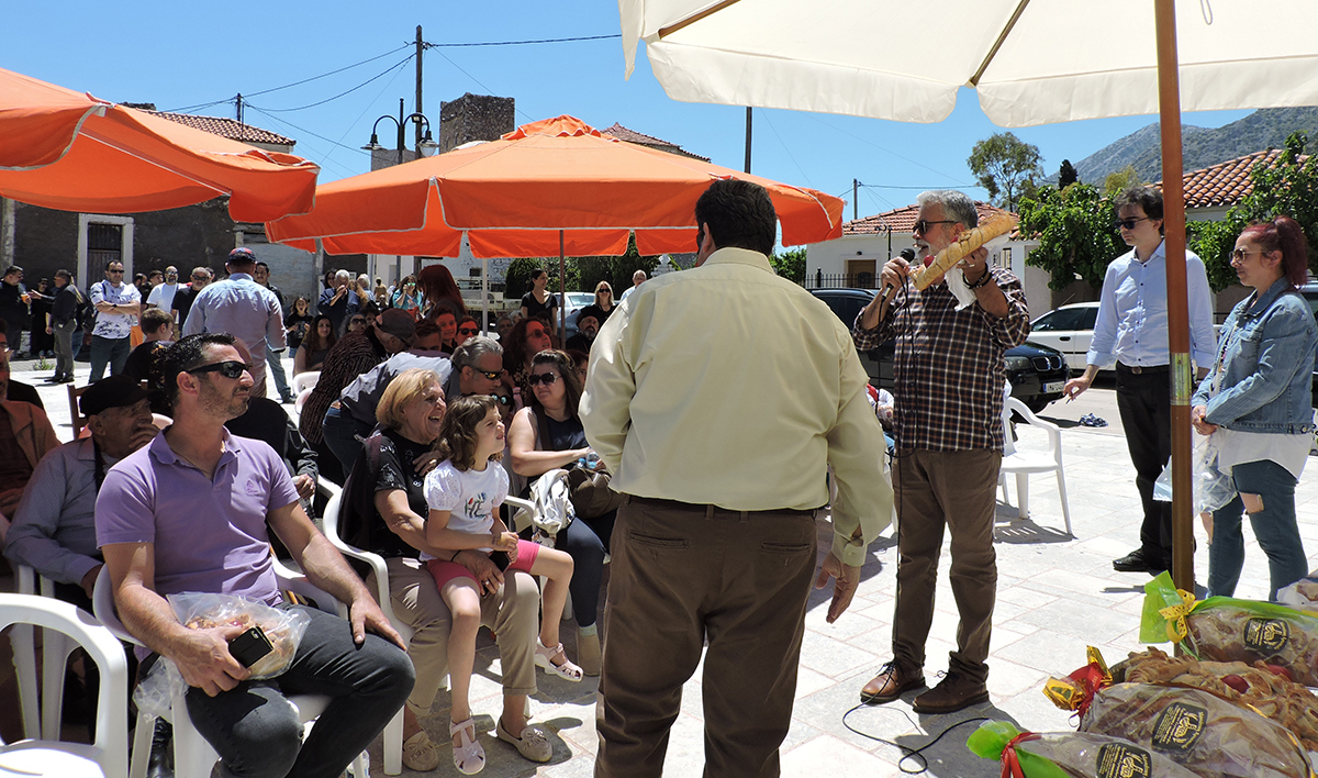 Ο δραστήριος Εκπολιτιστικός Σύλλογος Φλωμοχωριτών "Η Αγία Τριάς", με τον πρόεδρο του Χρήστο Μπουράνη και τα μέλη του ΔΣ, σε συνεργασία με τον άξιο εφημέριο π. Κωνσταντίνο Παντελεάκο, μετά την θεία λειτουργία και τη μετάβαση στο κοιμητήριο, μετά και την λιτανεία στο χωριό, μάς προσκάλεσαν το μεσημέρι στην μεγάλη πλατεία για εκδήλωση που σχετιζόταν με την ιστορική και λαογραφική προσέγγιση τού παλαιότατου μανιάτικου εθίμου "του Σταυρού". Εθίμου που αναζωπυρώθηκε στις μέρες μας, με την συνδρομή και τής γνωστής συμπατριώτισσάς μας συγγραφέως Ελένης Τζικάκου, η οποία είχε προετοιμάσει σε συνεργασία με τις Μανιάτισσες και τους Μανιάτες κάθε ηλικίας, ντόπιους και αποδήμους, την παρασκευή των εντυπωσιακών παραδοσιακών λαμπροκουλούρων, αλλά και τη δική μου, για μια αναφορά στο ιστορικό πλαίσιο, αλλά και την έκτακτη δημοπρασία που ακολούθησε!...