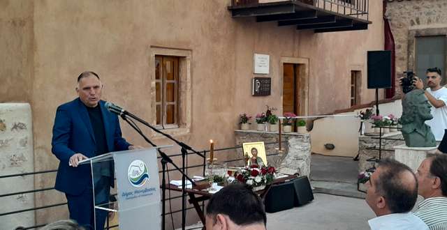 Φτάσαμε λοιπόν σε ένα σημείο όπου βρισκόμαστε στην αγαπημένη του πόλη στην οποία γεννήθηκε και την οποία ύμνησε. Και μάλιστα μία από τις πιο δυνατές δηλώσεις που ένιωσα εγώ είναι που λέει “τόπος γέννησής μου η Άκρα Μινώα”. Όλα αυτά τα χρόνια, μια σκέψη γύριζε συνέχεια στο μυαλό μου, πώς θα μπορέσουμε να ανταποδώσουμε και να τιμήσουμε αυτόν τον μεγάλο ποιητή ο οποίος κατάγεται από μας. Και πράγματι μας δόθηκε αυτή η ευκαιρία από την κόρη του Γιάννη Ρίτσου την κ. Έρη Ρίτσου, η οποία σε κάποια στιγμή θέλησε να δώσει το ακίνητο αυτό το δικό της. Και μάλιστα το ζητήσαμε εμείς να δοθεί με προορισμό να γίνει το μουσείο του πατέρα της. Της χρωστάμε ευγνωμοσύνη γι’ αυτό που έκανε που είναι προς όφελος του τόπου και της κοινωνίας. Θεωρώ χρέος μου να ευχαριστήσω την μελετητική ομάδα, η οποία είχε αναλάβει την κατασκευή του μουσείου. Και τούτο διότι αυτή η ομάδα είχε ένα δύσκολο έργο. Σε ένα πολύ μικρό χώρο έπρεπε να συμπυκνώσει ένα τόσο μεγάλο έργο και να δώσει στον κόσμο να καταλάβει ποια ήταν η προσωπικότητα του Γιάννη Ρίτσου και ποια ήταν η αξία του.