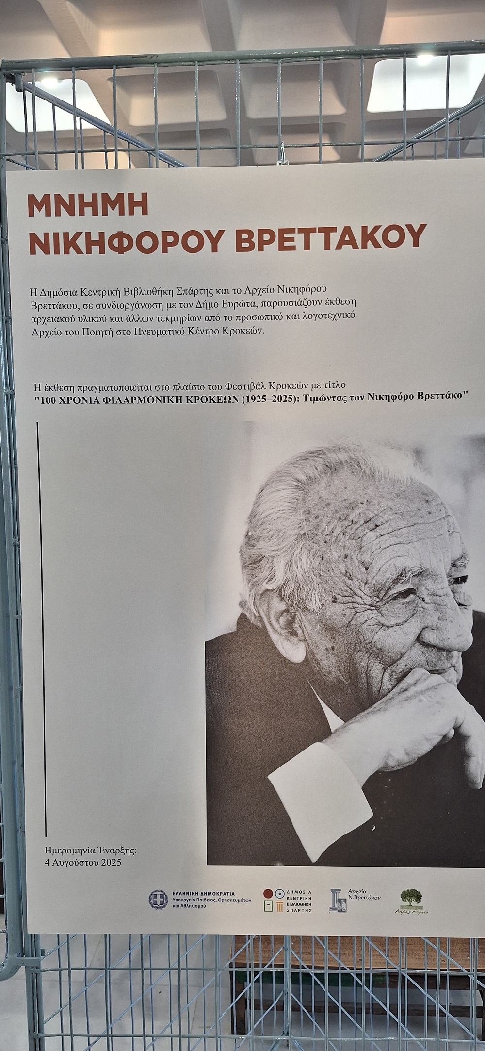 Τα εγκαίνια της έκθεσης με τίτλο «Μνήμη Νικηφόρου Βρεττάκου», η οποία φιλοξενείται στο Πνευματικό Κέντρο Κροκεών, πραγματοποιήθηκαν τη Δευτέρα (4/8). Η έκθεση που διεξάγεται σε συνεργασία του Δήμου Ευρώτα με την Δημόσια Κεντρική Βιβλιοθήκη Σπάρτης και το Αρχείο Νικηφόρου Βρεττάκου, εντάσσεται στο πλαίσιο των επετειακών εκδηλώσεων για τα 100 χρόνια από την ίδρυση της Φιλαρμονικής Κροκεών (1925-2025). Αποτελεί ένα βαθύτερο φόρο τιμής στον σπουδαίο Λάκωνα ποιητή, Νικηφόρο Βρεττάκο, που με το έργο και τη στάση ζωής του άφησε ανεξίτηλο αποτύπωμα στα ελληνικά γράμματα.