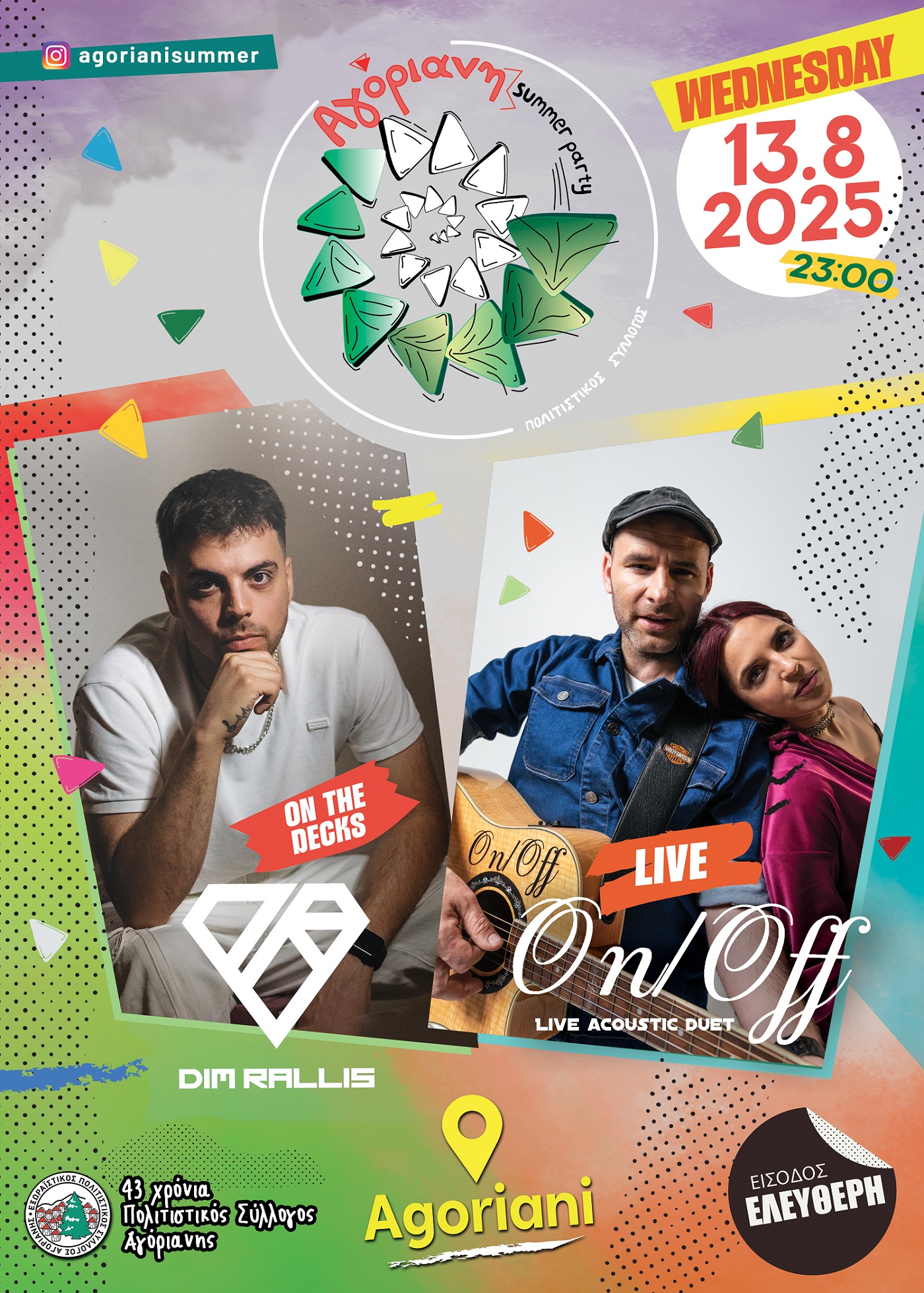 23:00 – Βραδιά νέων - Summer Party με το συγκρότημα «On/Off Acoustic Duet» και τον DJ Dim Rallis