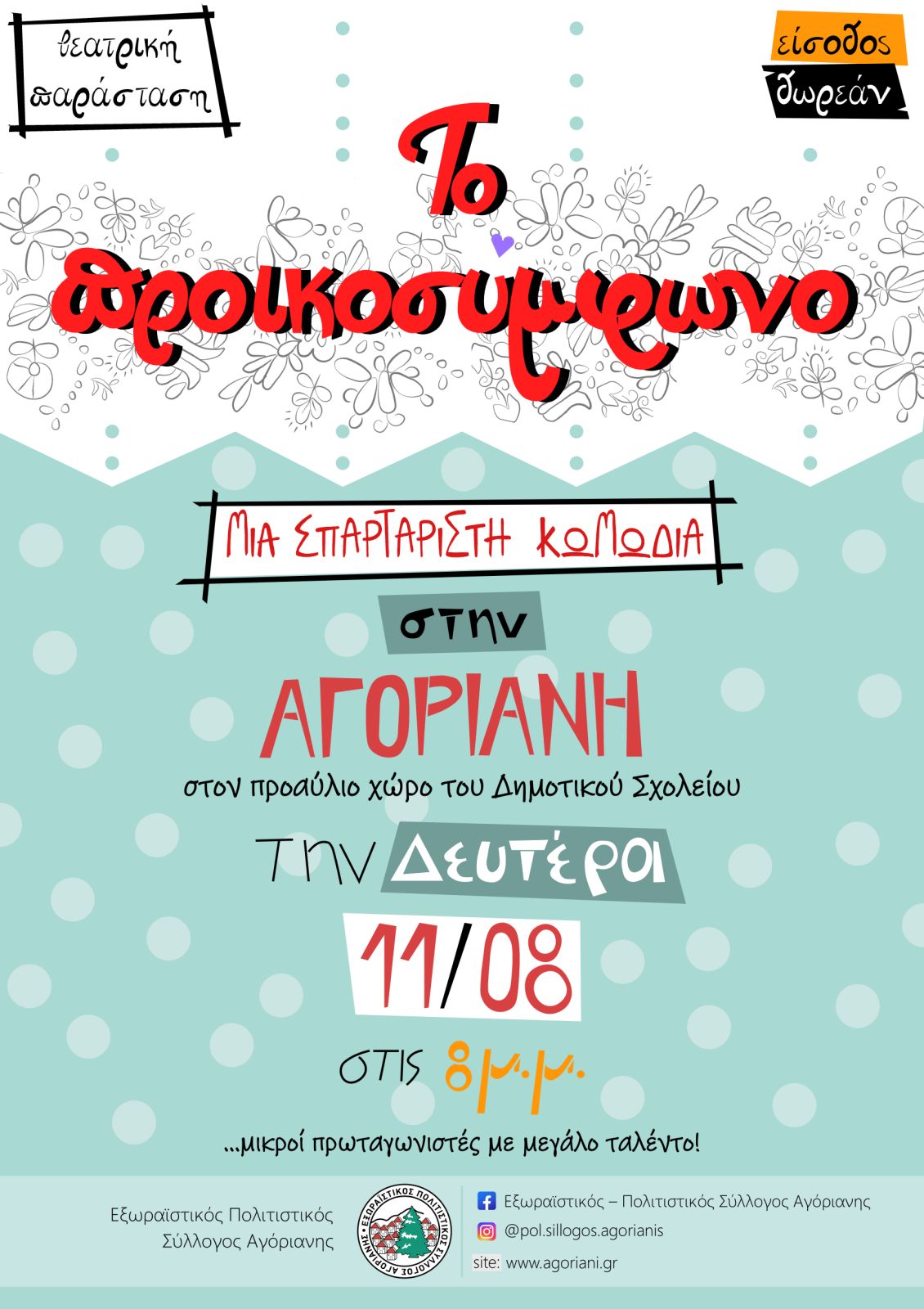 20:00 – Θεατρική παράσταση «Το Προικοσύμφωνο». Παραγωγή του Πολιτιστικού Συλλόγου με πρωταγωνιστές τους μικρούς φίλους