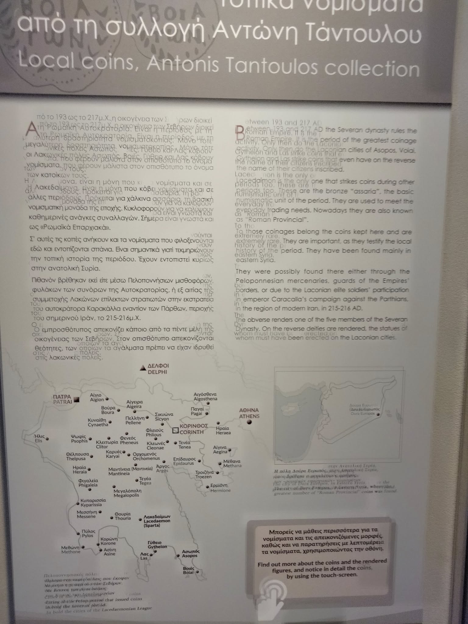 Η έκθεση των νομισμάτων συνοδεύεται από σύγχρονα μέσα ψηφιακής παρουσίασης, προσφέροντας στον επισκέπτη τη δυνατότητα να περιηγηθεί ψηφιακά στη συλλογή και να ενημερωθεί για κάθε νόμισμα ξεχωριστά μέσω ειδικά διαμορφωμένης οθόνης.