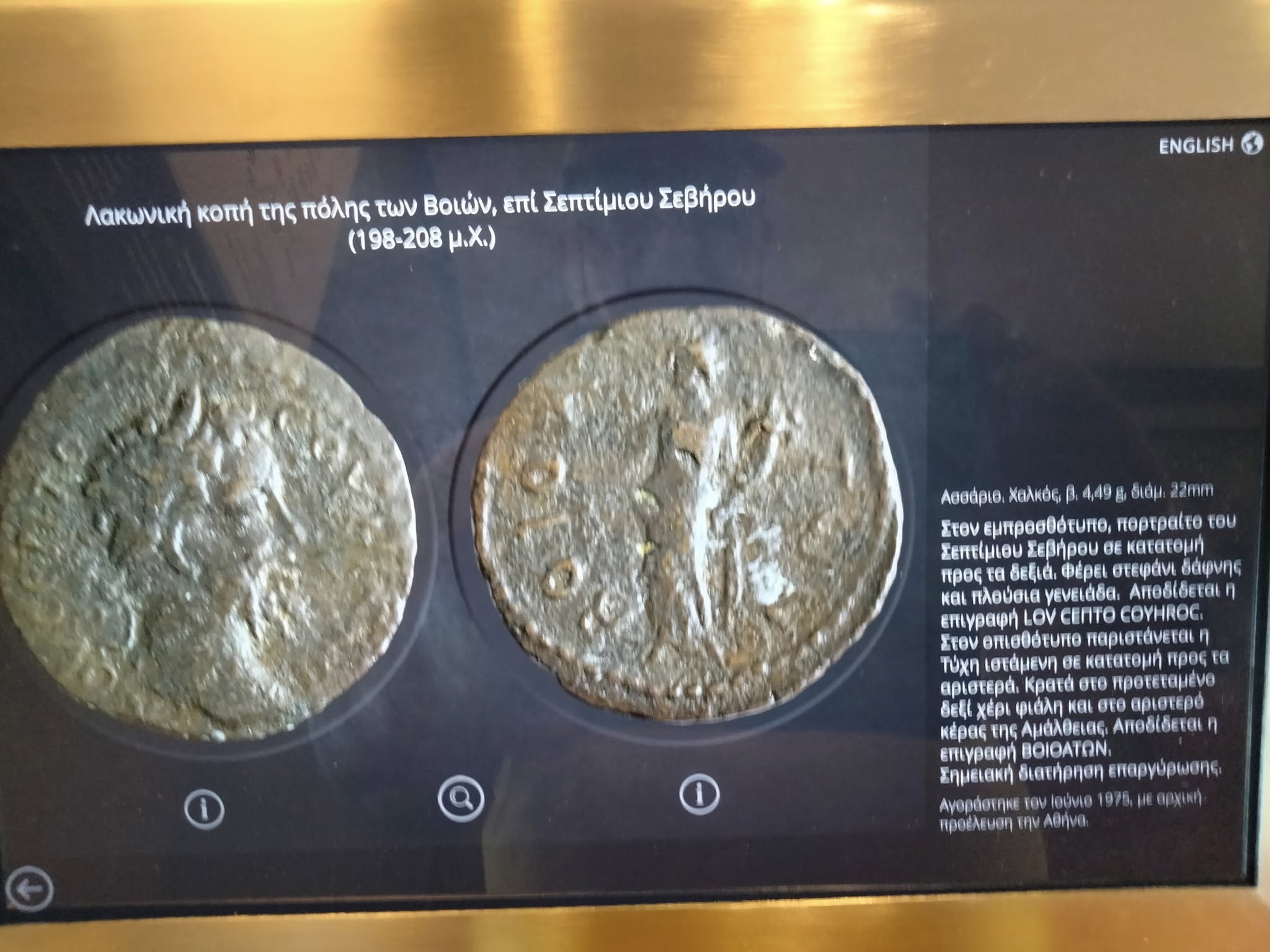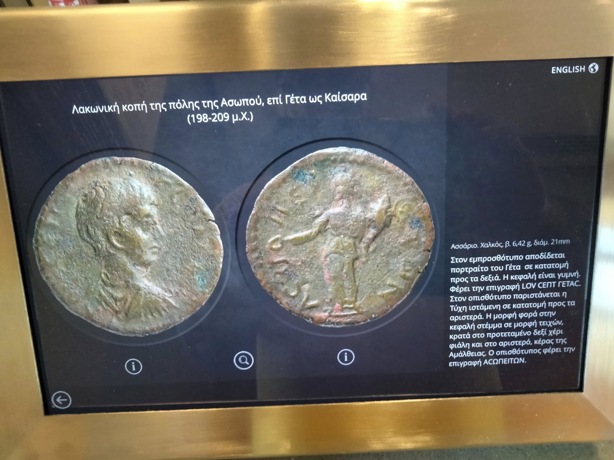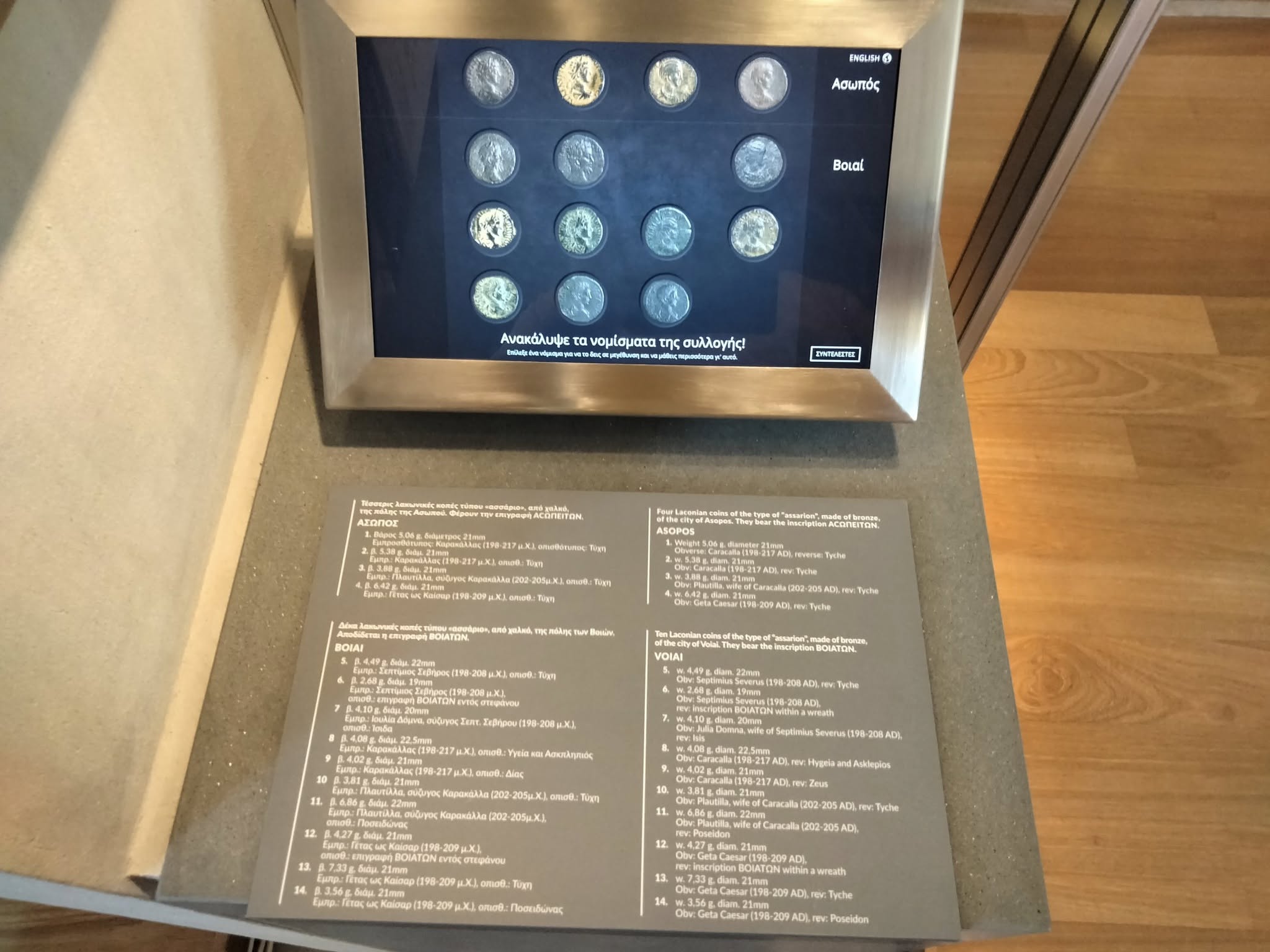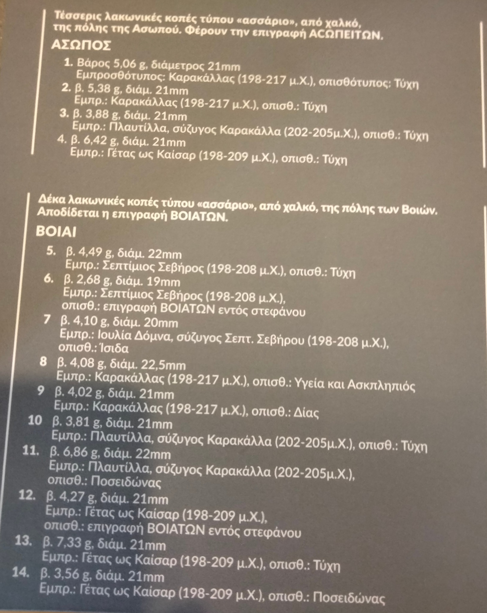 Η νέα αυτή συλλογή, που φιλοξενείται μόνιμα στο μουσείο, περιλαμβάνει 14 αρχαία νομίσματα, τα οποία χρονολογούνται από το 198 μΧ έως το 217 μΧ και σχετίζονται με το «Κοινό των Ελευθερολακώνων», μία συμμαχία 18 λακωνικών πόλεων κατά την περίοδο της Ρωμαϊκής Αυτοκρατορίας. Από αυτά, τα 10 προέρχονται από την πόλη των Βοιών και τα 4 από τον Ασωπό.