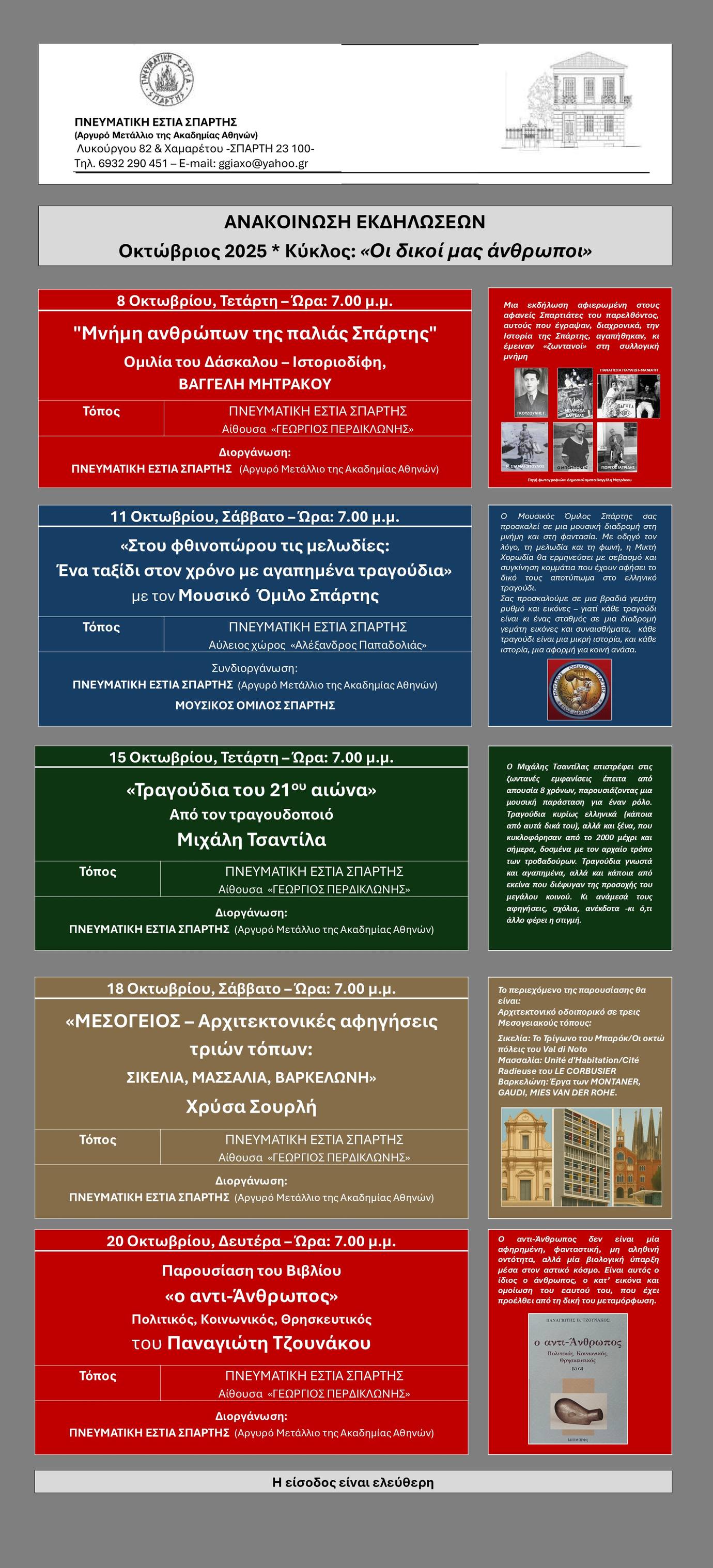 Η Πνευματική Εστία Σπάρτης (βραβεμένη με το Αργυρό Μετάλλιο της Ακαδημίας Αθηνών) παρουσιάζει τον Οκτώβριο έναν νέο κύκλο εκδηλώσεων υπό τον τίτλο «Οι δικοί μας άνθρωποι». Στόχος του φετινού προγράμματος είναι να τιμήσει τις μορφές, τις ιστορίες και τα έργα που συνέβαλαν στη διαμόρφωση της πολιτιστικής ταυτότητας της πόλης, μέσα από τη συγγραφή, τη μουσική, και την αρχιτεκτονική.