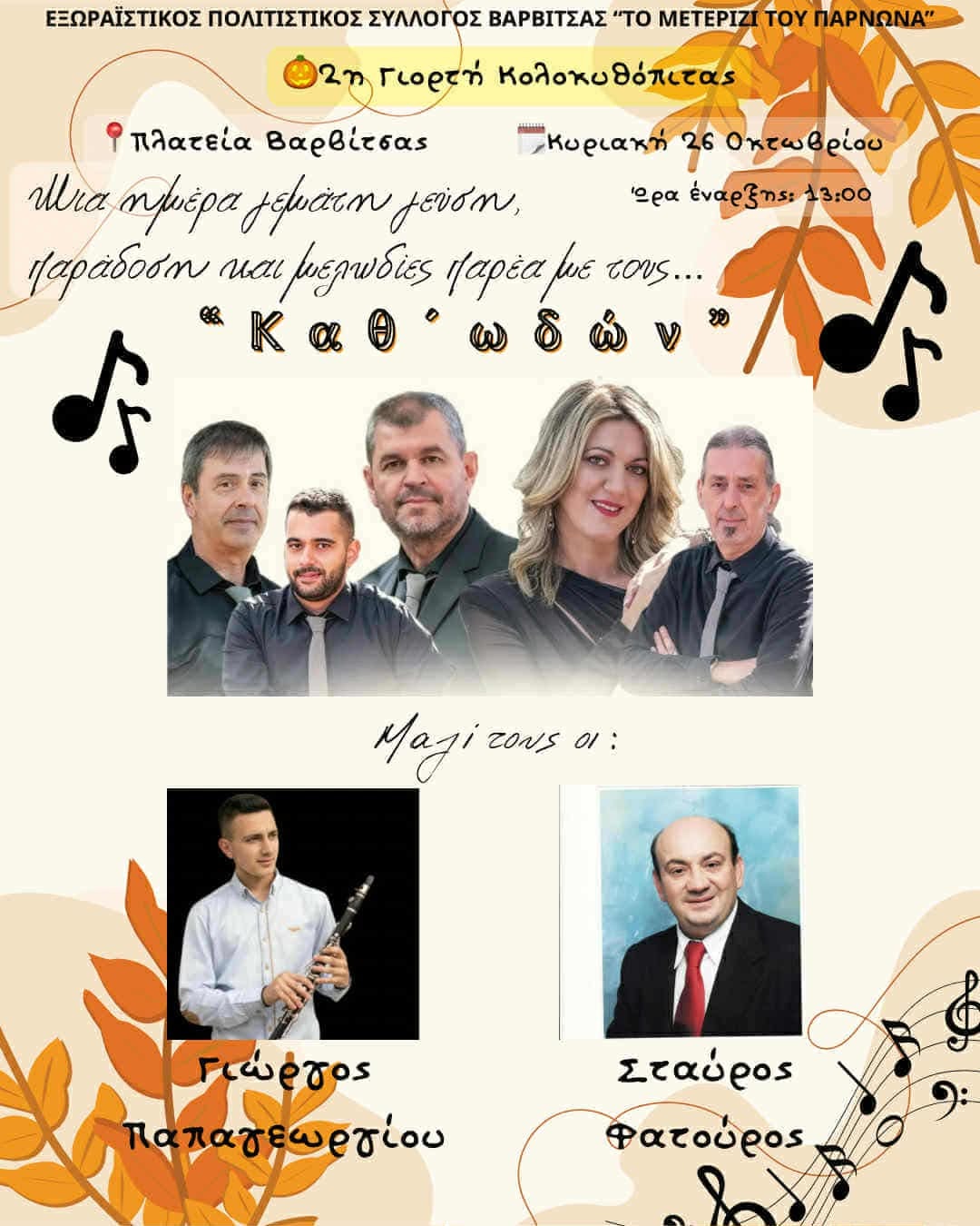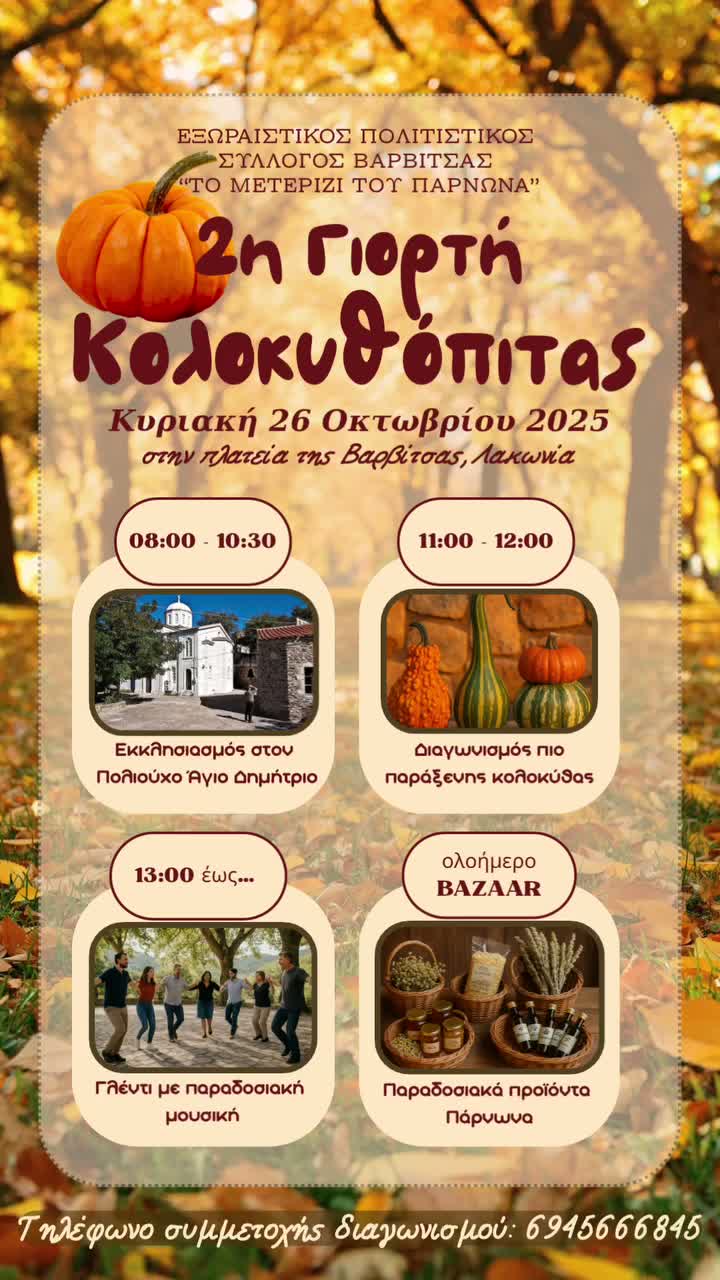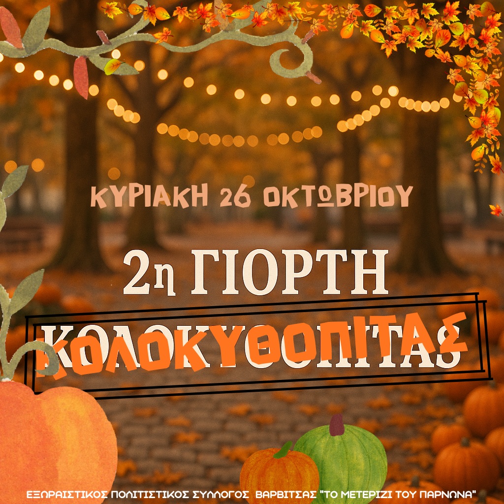 Ο Εξωραϊστικός Πολιτιστικός Σύλλογος Βαρβίτσας «Το μετερίζι του Πάρνωνα» διοργανώνει για δεύτερη συνεχόμενη χρονιά τη «Γιορτή Κολοκυθόπιτας», την Κυριακή 26 Οκτωβρίου, προσκαλώντας κατοίκους και επισκέπτες σε μια αυθεντική φθινοπωρινή εμπειρία στην πλατεία του χωριού, κάτω από τους αιωνόβιους πλατάνους.