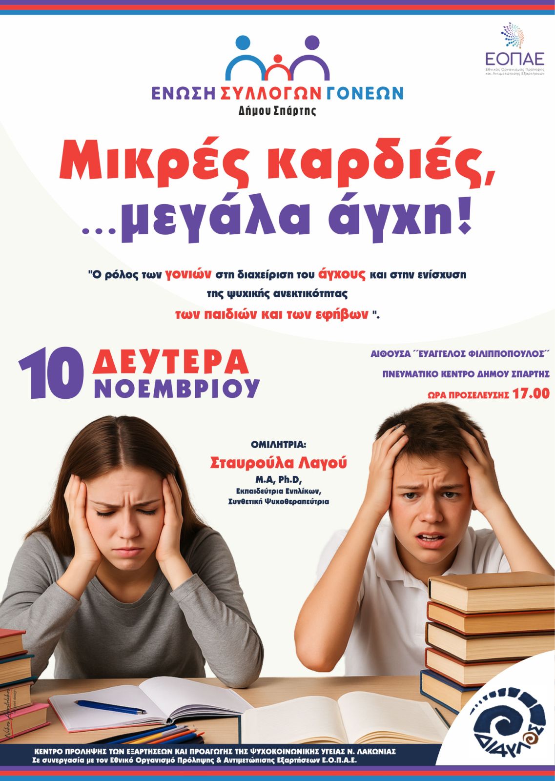 Η Ένωση Συλλόγων Γονέων Δήμου Σπάρτης, σε συνεργασία με το Κέντρο Πρόληψης «Δίαυλος» και τον Εθνικό Οργανισμό Πρόληψης και Αντιμετώπισης Εξαρτήσεων (Ε.Ο.Π.Α.Ε.), διοργανώνει μια ιδιαίτερα ενδιαφέρουσα ενημερωτική ημερίδα με τίτλο «Μικρές καρδιές, …μεγάλα άγχη!», τη Δευτέρα 10 Νοεμβρίου, στις 17:00, στην αίθουσα «Ευάγγελος Φιλιππόπουλος» του Πνευματικού Κέντρου Δήμου Σπάρτης.