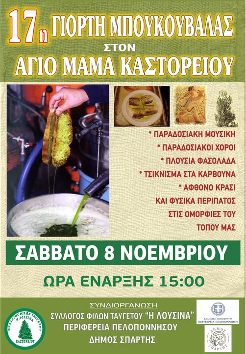 Οι παρευρισκόμενοι θα απολαύσουν παραδοσιακή μουσική και χορούς, πλούσια φασολάδα, τσιγκνίσματα στα κάρβουνα, άφθονο κρασί και φυσικά τη μοναδική μπουκουβάλα, το εκλεκτό παραδοσιακό έδεσμα της περιοχής. Παράλληλα, θα υπάρχει η δυνατότητα για περίπατο στις ομορφιές του Ταϋγέτου, γνωρίζοντας από κοντά το φυσικό κάλλος και την αυθεντικότητα του τόπου.