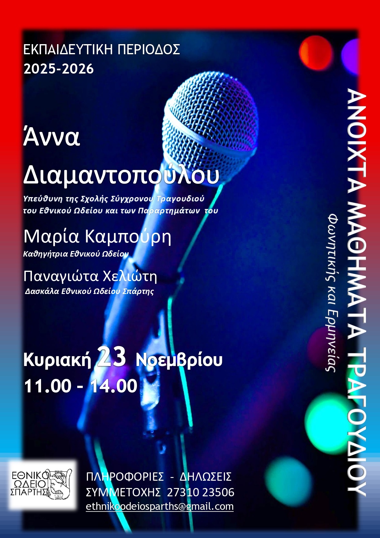 Μια ξεχωριστή μουσική εμπειρία περιμένει τους φίλους του τραγουδιού στη Σπάρτη. Την Κυριακή 23 Νοεμβρίου, από τις 11:00 έως τις 14:00, το Εθνικό Ωδείο Σπάρτης φιλοξενεί για δεύτερη συνεχή χρονιά την κορυφαία καθηγήτρια Άννα Διαμαντοπούλου, σε μια ανοιχτή εκπαιδευτική δράση αφιερωμένη στο σύγχρονο τραγούδι.
