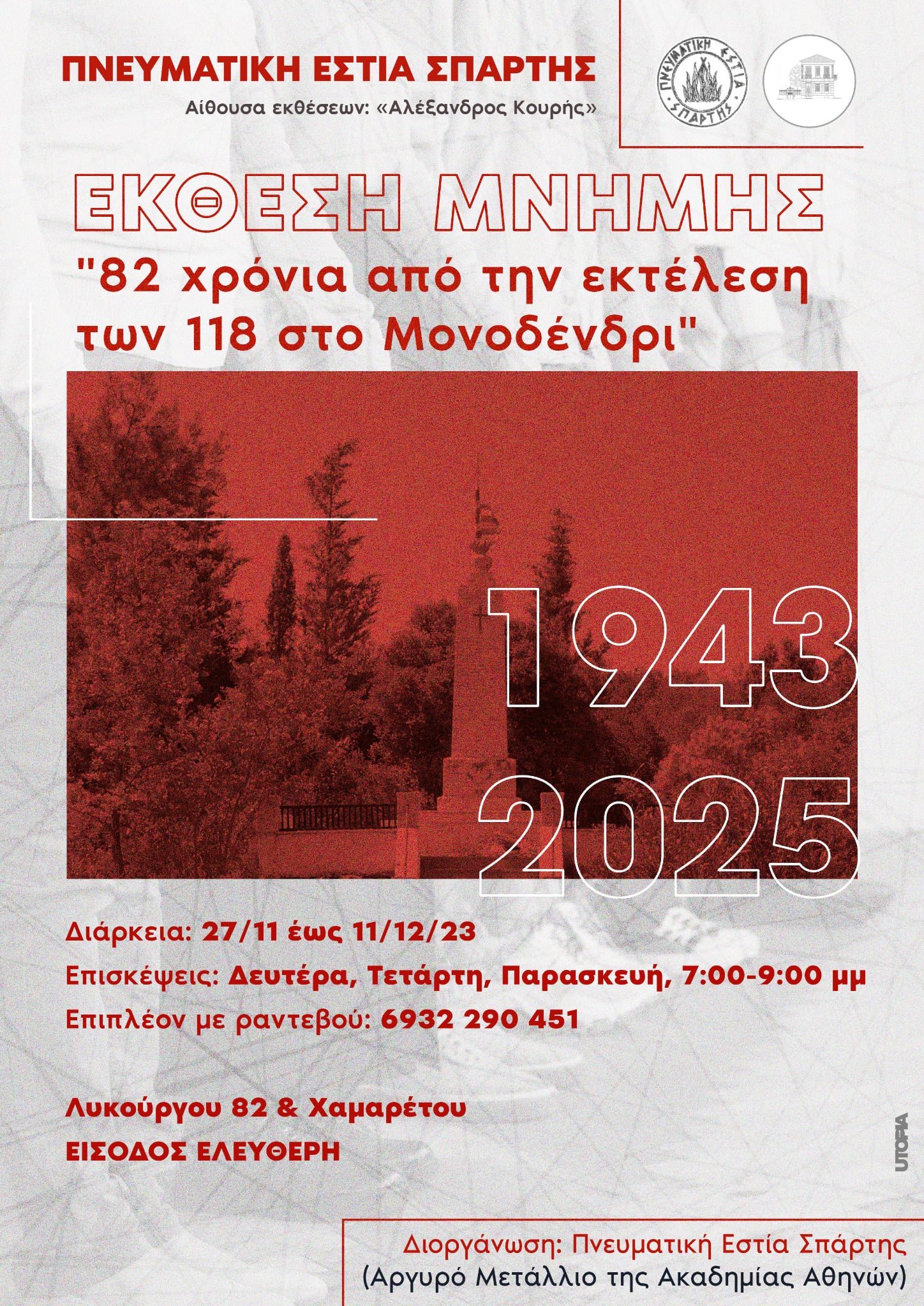 Η έκθεση αναδεικνύει, μέσα από αρχειακό υλικό, ιστορικά τεκμήρια και φωτογραφίες, την πορεία προς τη μαζική εκτέλεση των 118 Σπαρτιατών τον Δεκέμβριο του 1943 στο Μονοδένδρι. Στόχος της είναι όχι μόνο η ιστορική καταγραφή, αλλά και η διατήρηση της συλλογικής μνήμης των γεγονότων που σημάδεψαν τη Λακωνία και τη χώρα γενικότερα.