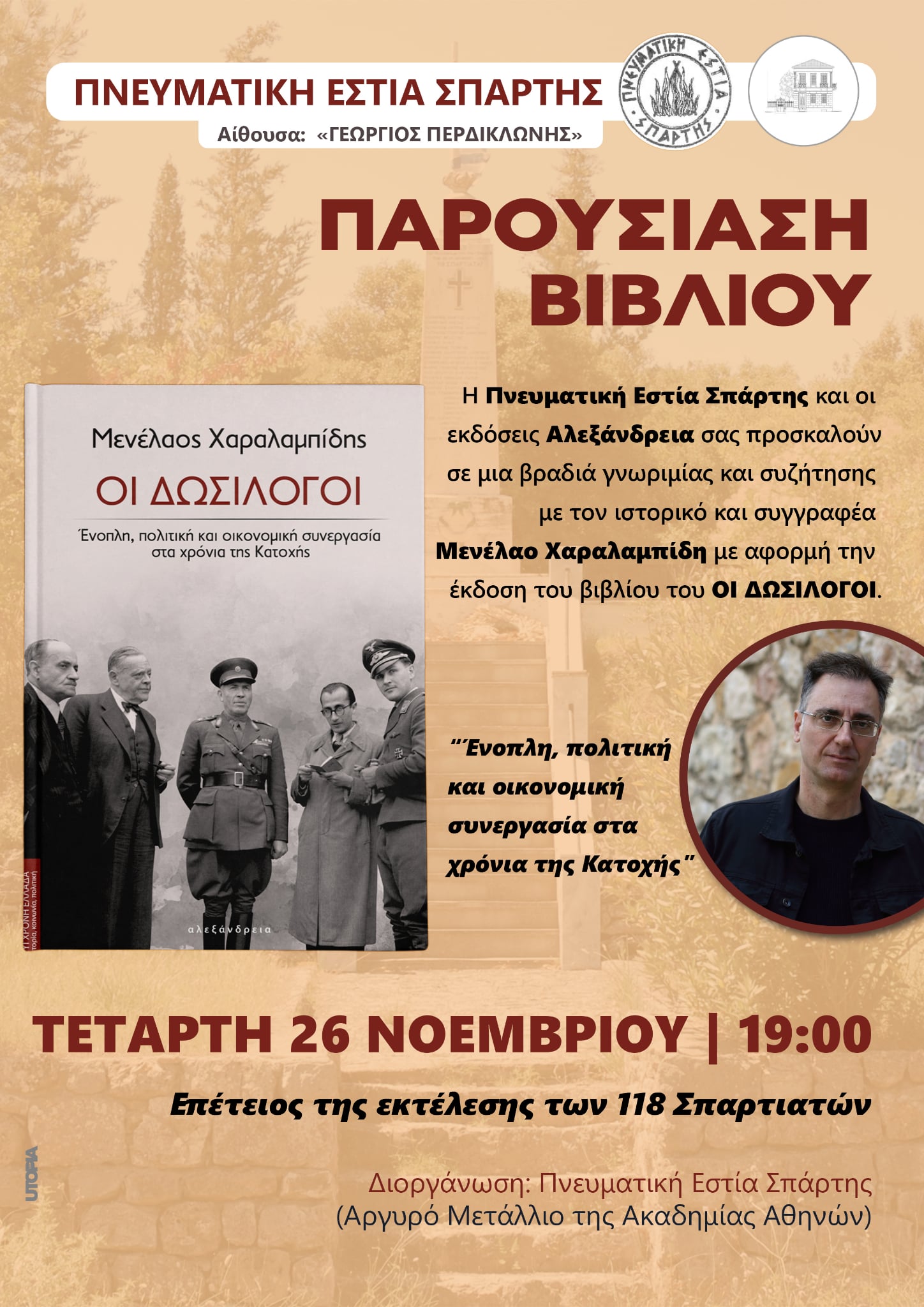 Την Τετάρτη 26 Νοεμβρίου, στις 7:00 μ.μ., στην αίθουσα «Γεώργιος Περδικλώνης» της Πνευματικής Εστίας, θα πραγματοποιηθεί εκδήλωση παρουσίασης του νέου βιβλίου του ιστορικού και συγγραφέα Μενέλαου Χαραλαμπίδη, με τίτλο: «Οι Δωσίλογοι – Ένοπλη, πολιτική και οικονομική συνεργασία στα χρόνια της Κατοχής».