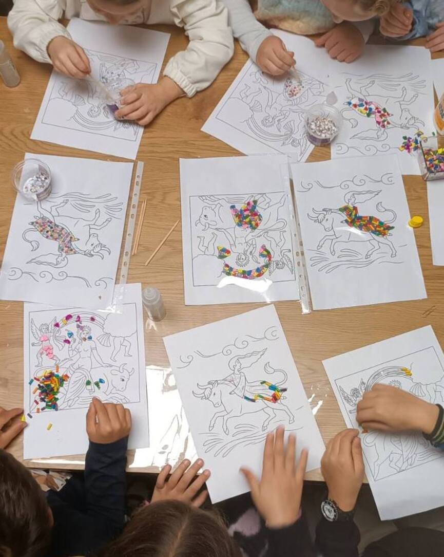 Ακολούθησε συζήτηση γύρω από τον μύθο, αλλά και γύρω από τα γνωστά ψηφιδωτά που κοσμούν τη πλατεία της Σπάρτης, τα οποία αποτέλεσαν πηγή έμπνευσης για το επόμενο στάδιο της δράσης: ένα βιωματικό εργαστήριο χειροτεχνίας. Εκεί, οι μικροί συμμετέχοντες δημιούργησαν τα δικά τους έργα βασισμένα στην τεχνική του ψηφιδωτού, χρησιμοποιώντας χρώματα, μοτίβα και υλικά που ενίσχυαν τη φαντασία και την καλλιτεχνική έκφραση. Η δράση ολοκληρώθηκε μέσα σε ένα κλίμα ενθουσιασμού και συνεργασίας, επιβεβαιώνοντας την αξία της δημιουργικής επαφής των παιδιών με την τοπική πολιτιστική κληρονομιά.