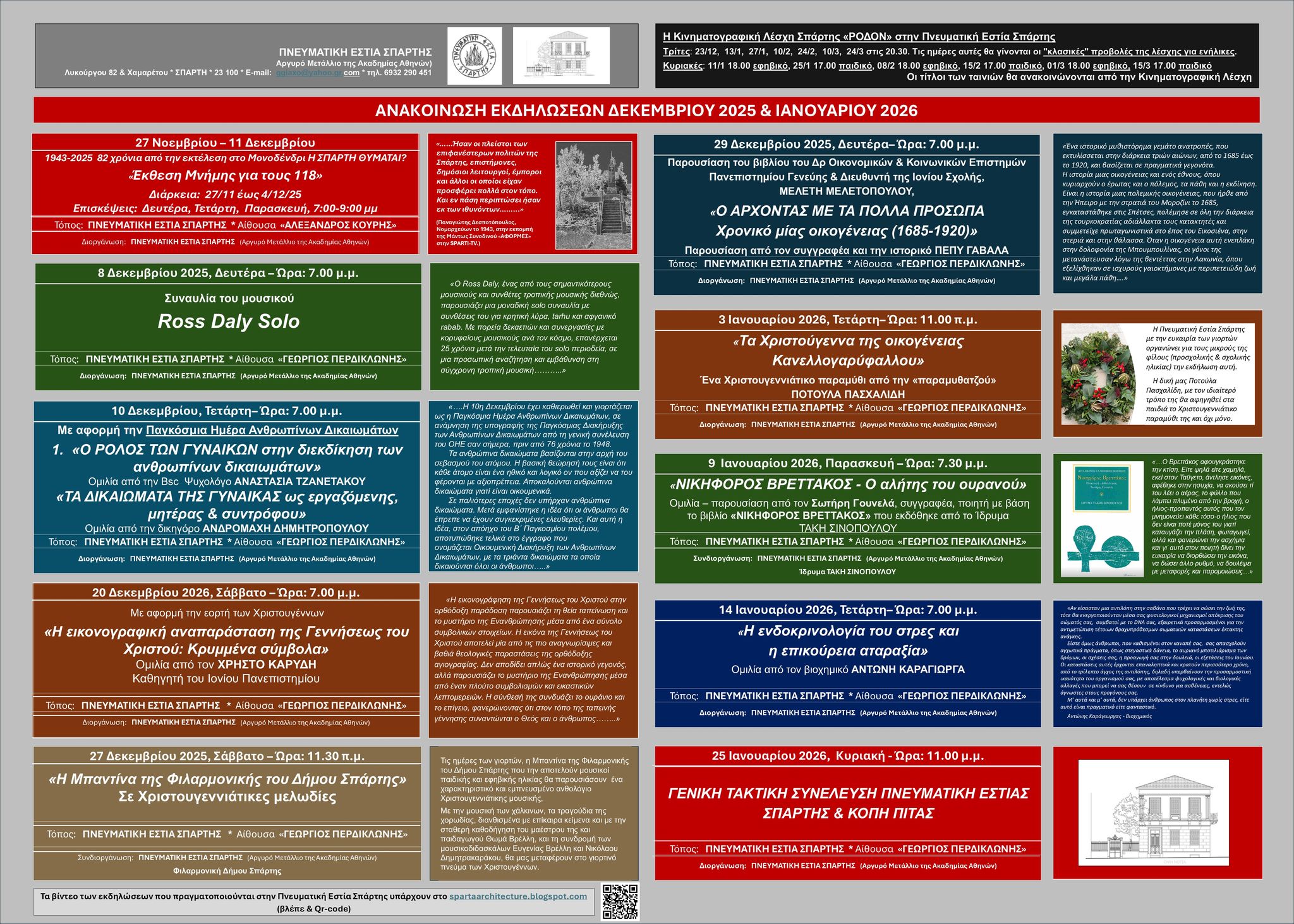 Με έναν κύκλο εκδηλώσεων που συνδυάζει μνήμη, τέχνη, μουσική, γνώση και γιορτινή ατμόσφαιρα, η Πνευματική Εστία Σπάρτης παρουσιάζει το πρόγραμμα Δεκεμβρίου – Ιανουαρίου, προσκαλώντας το κοινό σε μια σειρά ιδιαίτερων στιγμών.
