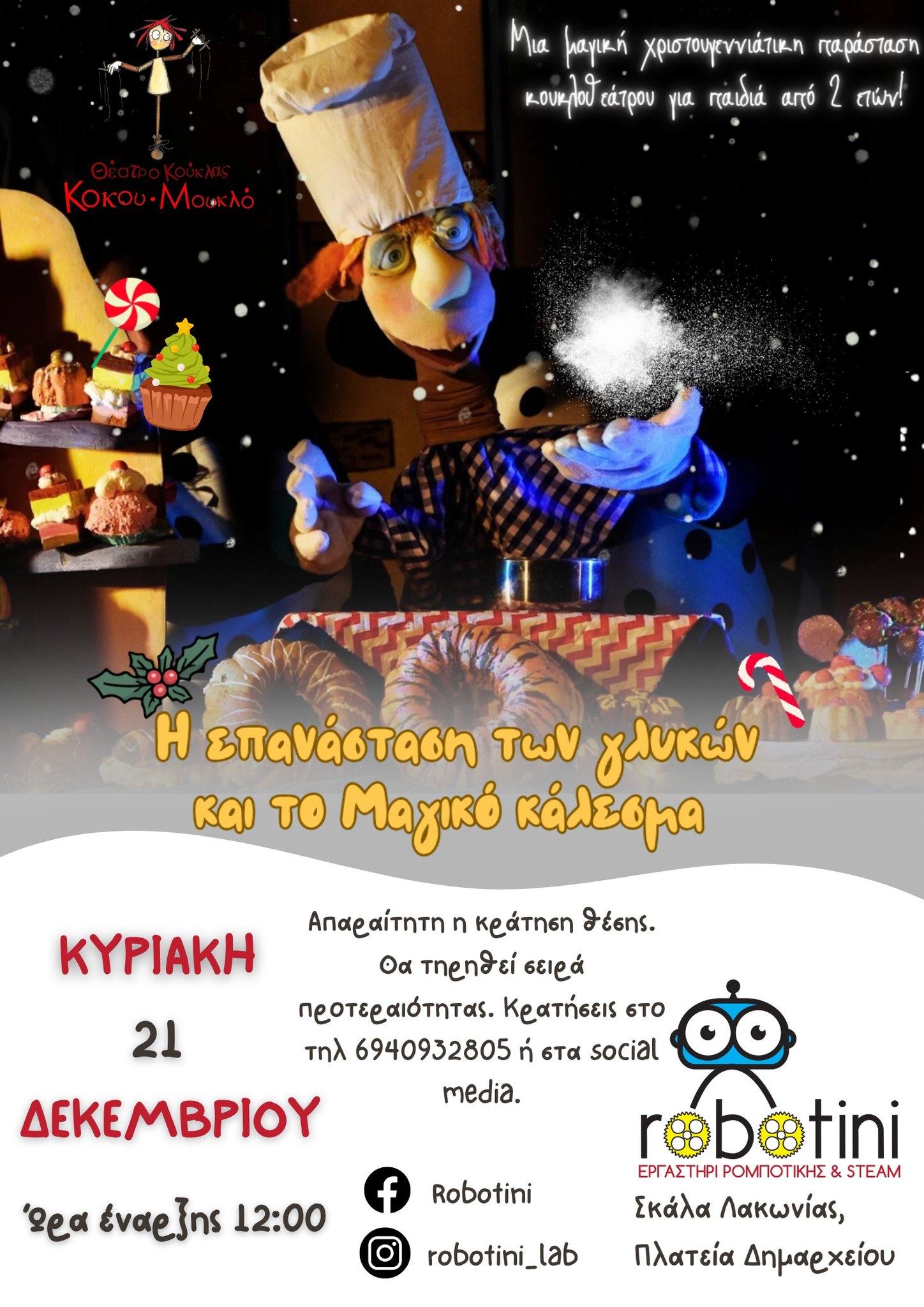 Μια μαγική χριστουγεννιάτικη εμπειρία περιμένει τους μικρούς θεατές στη Σκάλα, την Κυριακή 21 Δεκεμβρίου, μέσα από μια ξεχωριστή παιδική θεατρική παράσταση κουκλοθεάτρου. Η θεατρική ομάδα Κοκου-Μουκλό φιλοξενείται στο εργαστήρι Robotini και παρουσιάζει μια ζεστή, γιορτινή παράσταση με κούκλες τύπου muppet και ατμόσφαιρα γεμάτη χρώματα, μουσική και… άρωμα κανέλας.