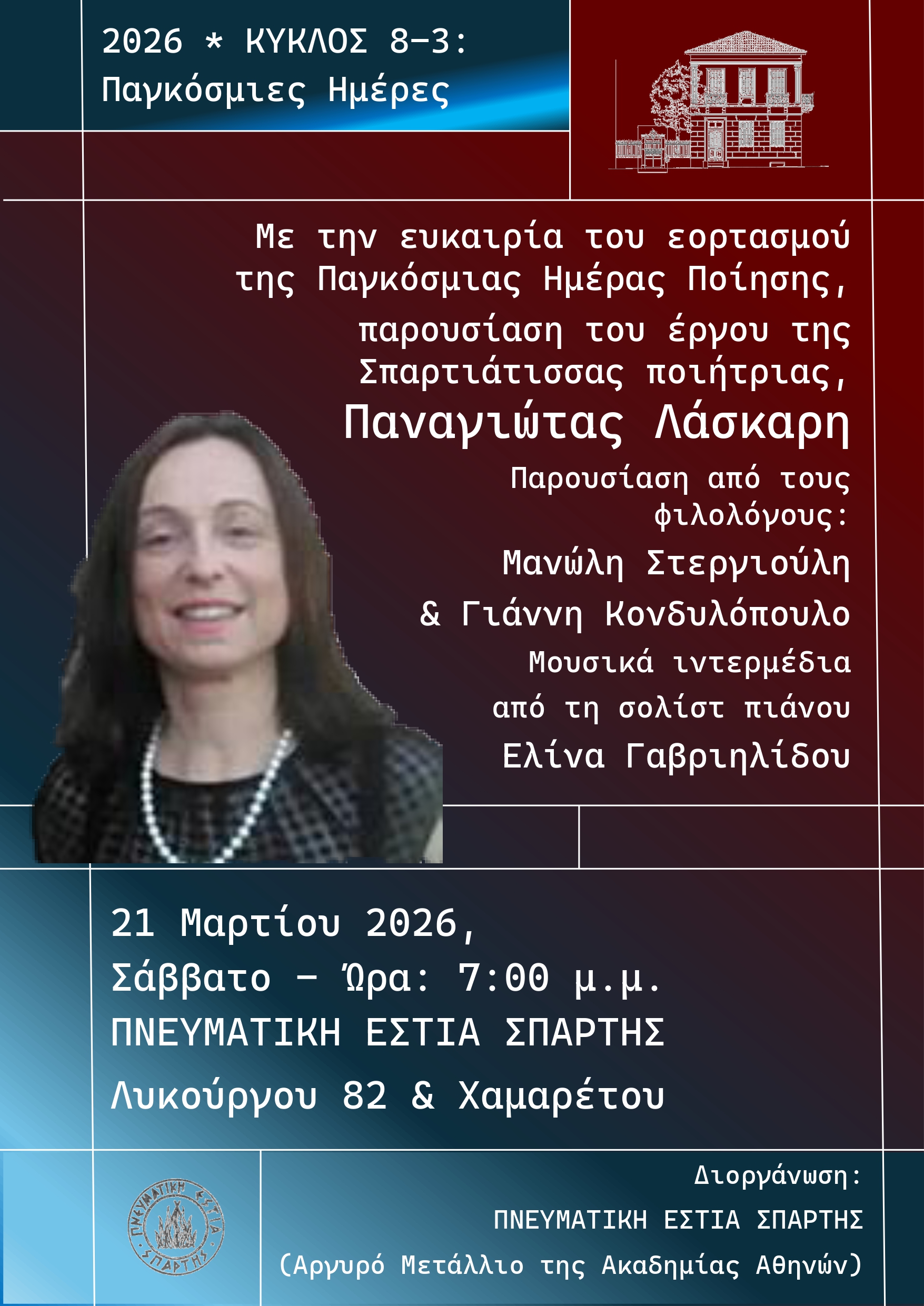 Με αφορμή τον εορτασμό της Παγκόσμιας Ημέρας Ποίησης, ένα ξεχωριστό λογοτεχνικό αφιέρωμα πρόκειται να φιλοξενήσει η Πνευματική Εστία Σπάρτης το Σάββατο 21 Μαρτίου και ώρα 7:00 μ.μ., τιμώντας το έργο της Σπαρτιάτισσας ποιήτριας Παναγιώτας Λάσκαρη.