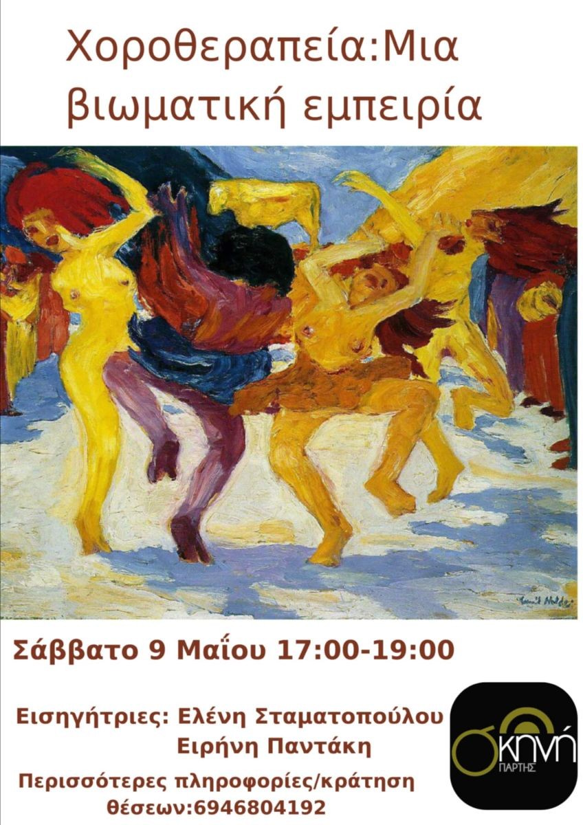 Με τίτλο «Χοροθεραπεία: Μια βιωματική εμπειρία», η δράση απευθύνεται σε όλους, ανεξαρτήτως ηλικίας ή προηγούμενης εμπειρίας, και έχει στόχο να μυήσει τους συμμετέχοντες στη χοροθεραπεία μέσα από απλές, καθοδηγούμενες ασκήσεις κίνησης. Πρόκειται για μια διαδικασία που αξιοποιεί το σώμα ως μέσο έκφρασης, ενισχύοντας τη σύνδεση με τον εαυτό και τους άλλους.