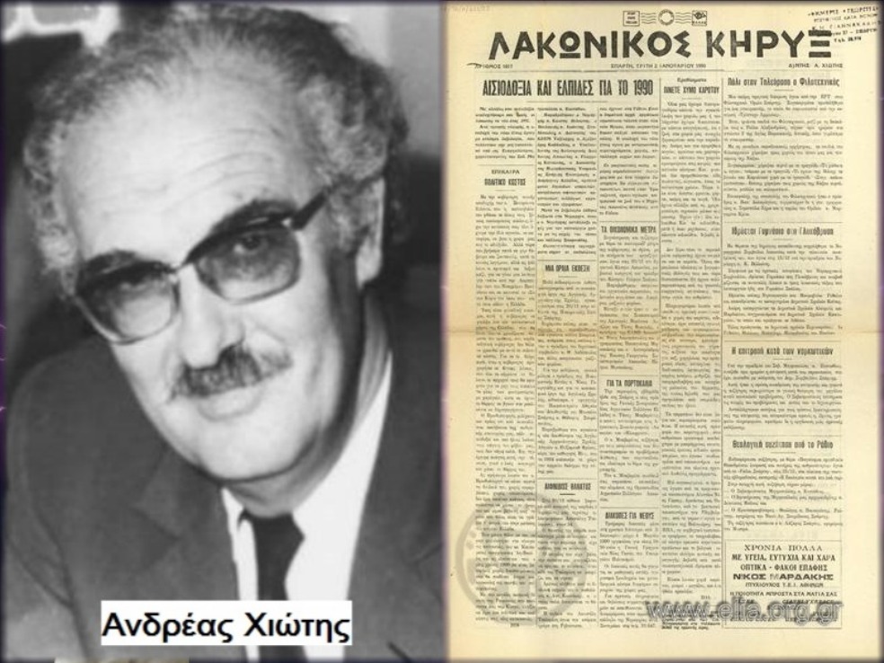 (Ο Ανδρέας Χιώτης, ένας προικισμένος, οξυδερκής και πολυπράγμων Σπαρτιάτης, με την μακρόχρονη θητεία του στον Τύπο της Σπάρτης, κατέγραψε και διέσωσε ένα μεγάλο μέρος της ιστορίας και της ζωής (κοινωνικής, πολιτικής, πολιτιστικής κλπ) της Σπάρτης και της Λακωνίας.)