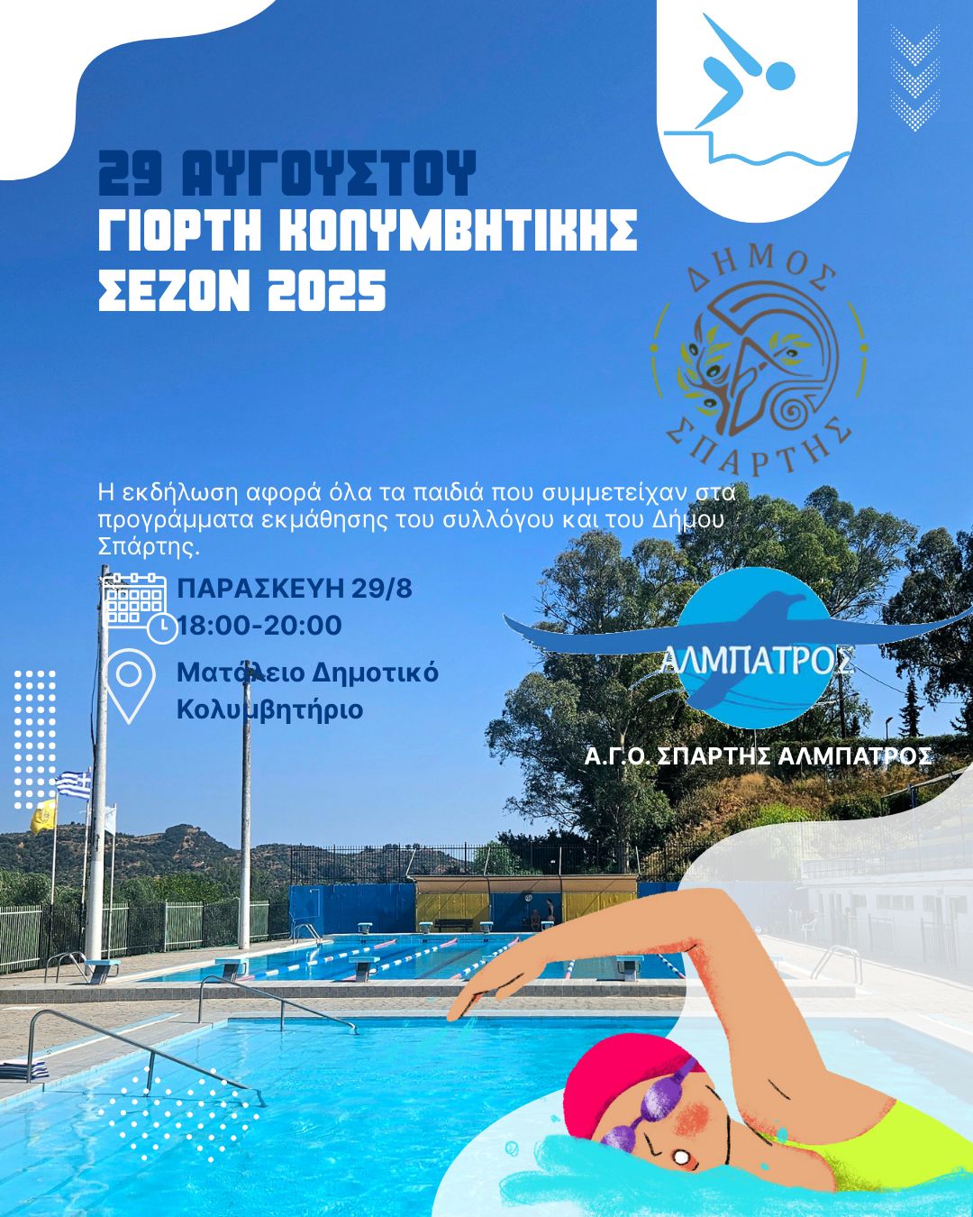Τη «Γιορτή Κολυμβητικής Σεζόν 2025» διοργανώνει ο Αθλητικός Γυμναστικός Όμιλος (ΑΓΟ) Σπάρτης «Άλμπατρος», σε συνεργασία με τον Δήμο Σπάρτης, την Παρασκευή 29 Αυγούστου στο Ματάλειο Δημοτικό Κολυμβητήριο Σπάρτης.