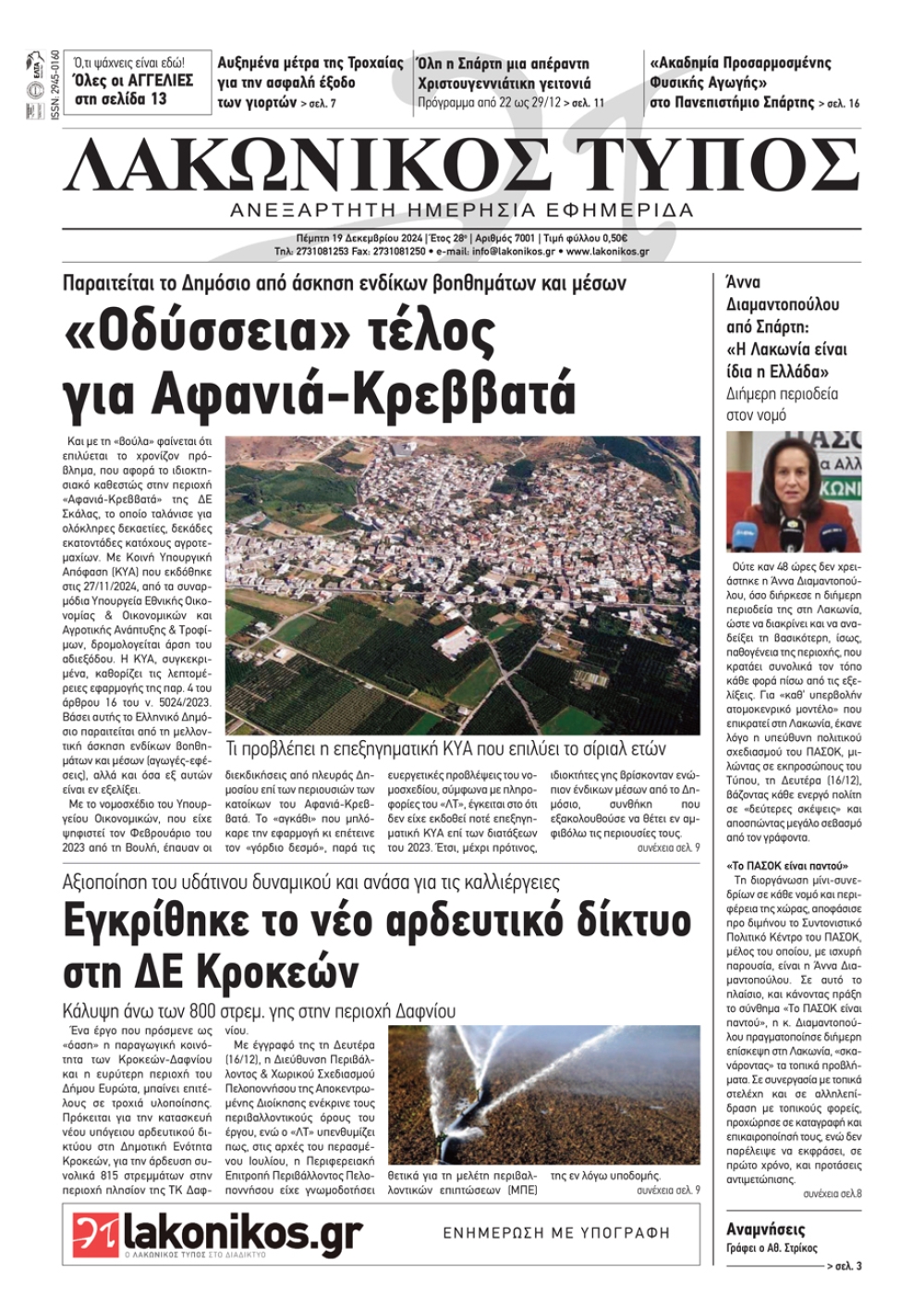 Ανακοίνωση: Μη κυκλοφορία του «Λακωνικού Τύπου» το Σάββατο 6/12
