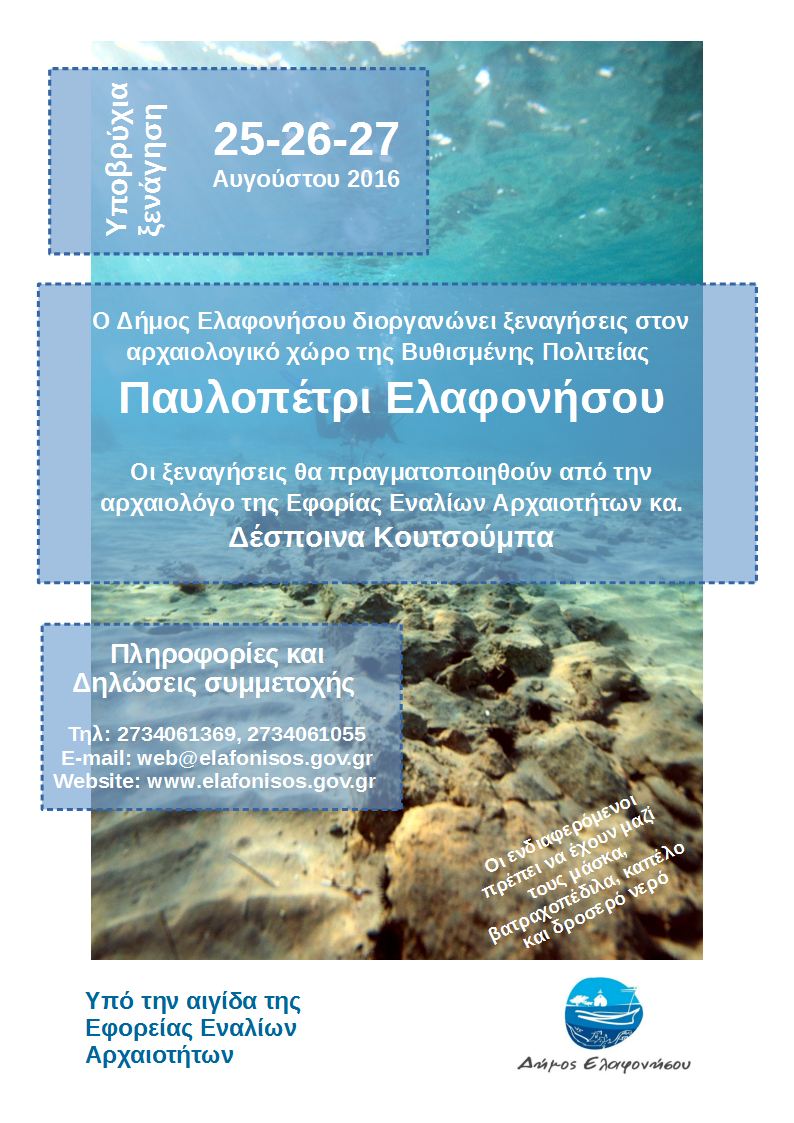 Υποβρύχιες ξεναγήσεις, για μικρούς και μεγάλους, στο βυθισμένο προϊστορικό Παυλοπέτρι διοργανώνει ο Δήμος Ελαφονήσου σε συνεργασία με την Εφορεία Εναλίων Αρχαιοτήτων, στο πλαίσιο της προσπάθειας για την προστασία και την ανάδειξη οικισμού.