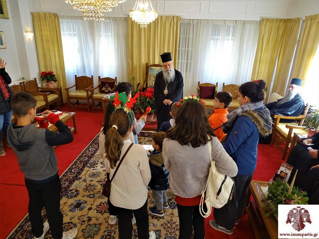Τα παιδιά, συνοδευόμενα από την προϊσταμένη του σχολείου κ. Παναγιώτα Αλειφέρη και τους εκπαιδευτικούς τους, περιηγήθηκαν στον χώρο κι έψαλαν τα κάλαντα κι άλλα Χριστουγεννιάτικα τραγούδια στον αντιπεριφερειάρχη Θεόδωρο Βερούτη.