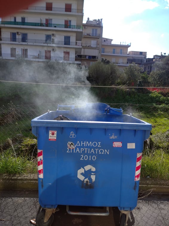 Κάποιος ή κάποια απερίσκεπτος, εναπόθεσε τις στάχτες από το τζάκι του σε μπλε κάδο ανακύκλωσης (ούτε καν στον κάδο των κοινών σκουπιδιών που βρισκόταν ακριβώς δίπλα) με αποτέλεσμα η στάχτη να ανάψει και καπνοί να βγαίνουν από αυτόν.