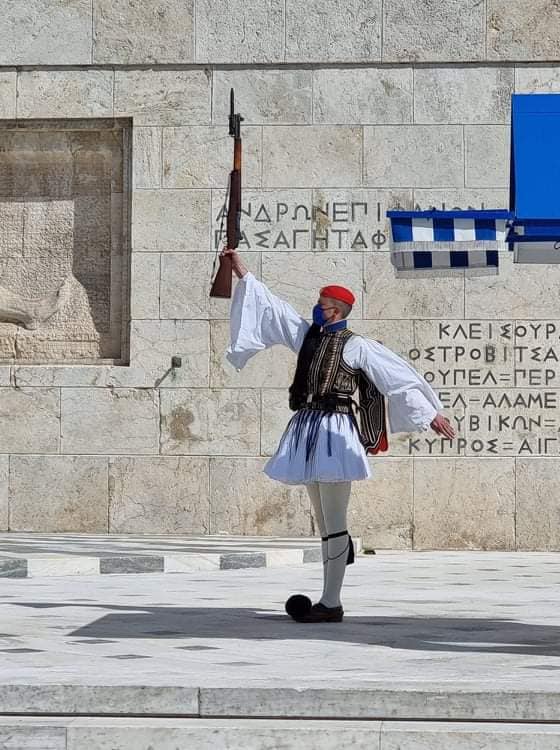 «Οι Εύζωνες κατά τον βηματισμό χτυπούν το τσαρούχι για να ακούνε οι Άγνωστοι νεκροί του Έθνους. Σήμερα κατά την αποχώρηση τους από το Μνημείο, η απόλυτη ησυχία που επικρατούσε, το χτύπημα ακουγόταν ως Σύνθημα, για την νέα αρχή του Ελληνισμού»,