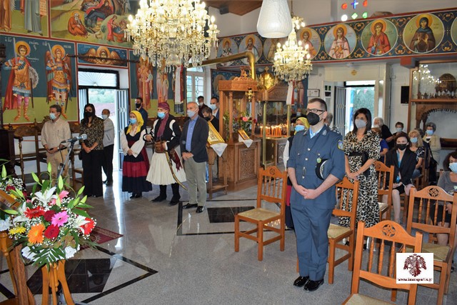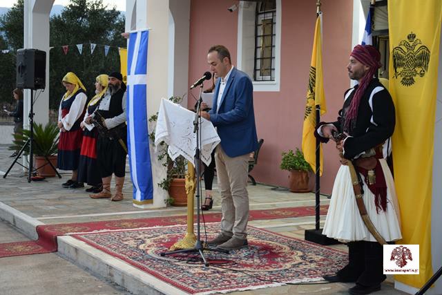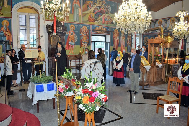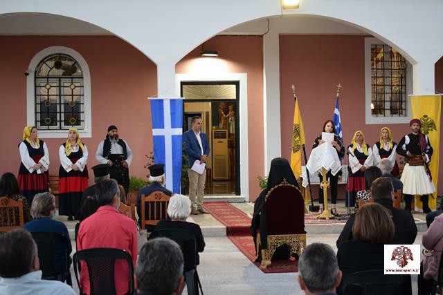 Εν συνεχεία, στον προαύλιο χώρο του Ιερού Ναού, καλωσόρισε τους παρευρισκόμενους ο Επίτροπος του Ναού κ. Παναγιώτης Δημητρόπουλος. Επίκαιρη ομιλία εξεφώνησε η εκπαιδευτικός κ. Βασιλική Βλάχου. Ακολούθως ο κ. Ηλίας Περγάντης, με τη βοήθεια συνεργατών του, έκανε παρουσίαση αυθεντικών παραδοσιακών φορεσιών και οπλισμού.