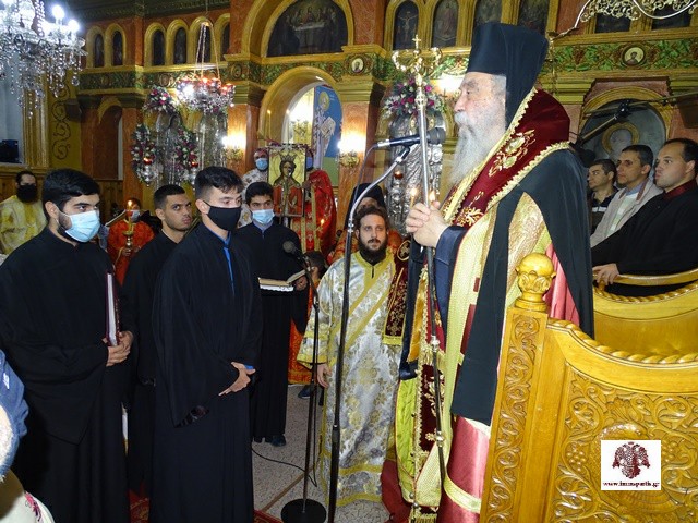 Συγκεκριμένα, το απόγευμα της παραμονής τελέσθηκε ο πανηγυρικός αρχιερατικός εσπερινός μετ’ αρτοκλασίας, χοροστατούντος του σεβασμιωτάτου Μητροπολίτη Μονεμβασίας και Σπάρτης κ. Ευσταθίου. Επίκαιρα μίλησε ο αρχιερατικός επίτροπος Σπάρτης και εφημέριος του ΙΝ Αγ. Σπυρίδωνος, πανοσ. αρχ. Σεραφείμ Κοσμάς.