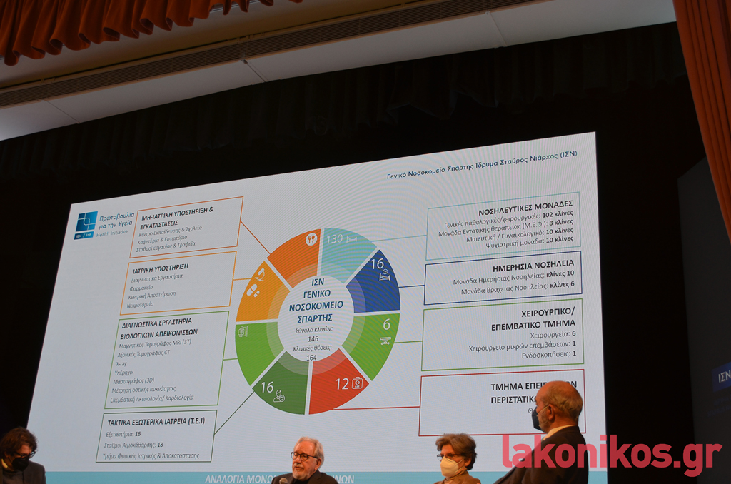 Ο διοικητικός διευθυντής του Ιδρύματος Σταύρος Νιάρχος, Πάνος Παπούλιας, εξέθεσε αρχικά τις δράσεις του ιδρύματος στο πλαίσιο της «Πρωτοβουλίας για την Υγεία» και μίλησε για τη σημασία του νέου Νοσοκομείου Σπάρτης, ενώ ο γγ Πρωτοβάθμιας Φροντίδας Υγείας, Μάριος Θεμιστοκλέους, εξέφρασε την ικανοποίησή του για την υλοποίηση ενός νοσοκομείου που θα προσιδιάζει σε ευρωπαϊκά πρότυπα.