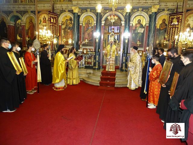 Ακολούθησε, εντός του Ιερού Ναού, κατά την εκκλησιαστική τάξη, η λιτάνευση των ιερών εικόνων σε ανάμνηση της αναστηλώσεώς τους το έτος 843, ενώ ο σεβασμιώτατος ανέγνωσε το Συνοδικό της Ορθοδοξίας.