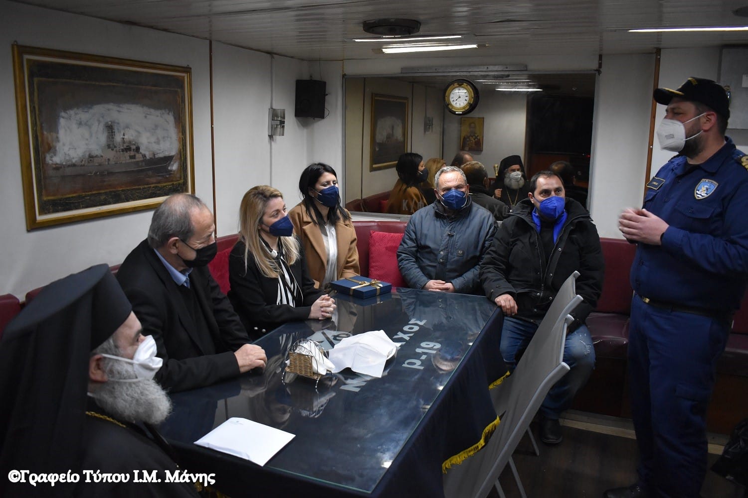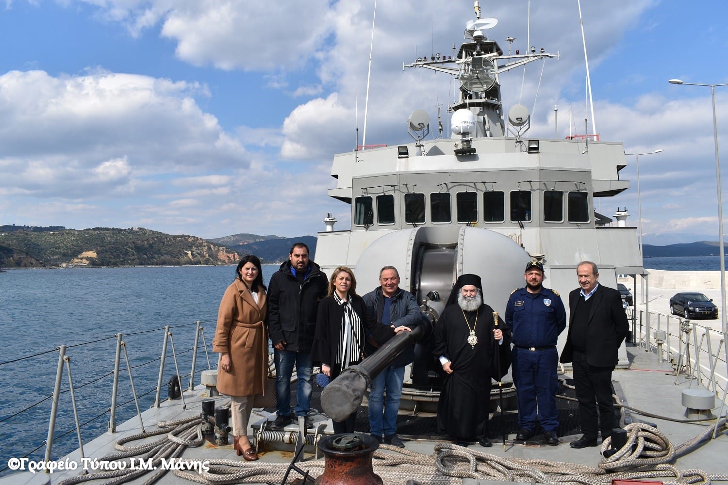 Ο Μητροπολίτης, συνοδευόμενος από τον δήμαρχο Ανατολικής Μάνης Πέτρο Ανδρεάκο, την πρόεδρο του Δημοτικού Συμβουλίου Γεωργία Λυροφώνη και την αντιδήμαρχο Ελένη Δρακουλάκου, έγινε δεκτός από τον κυβερνήτη του πλοίου, Πλωτάρχη Γ. Ρόκα.