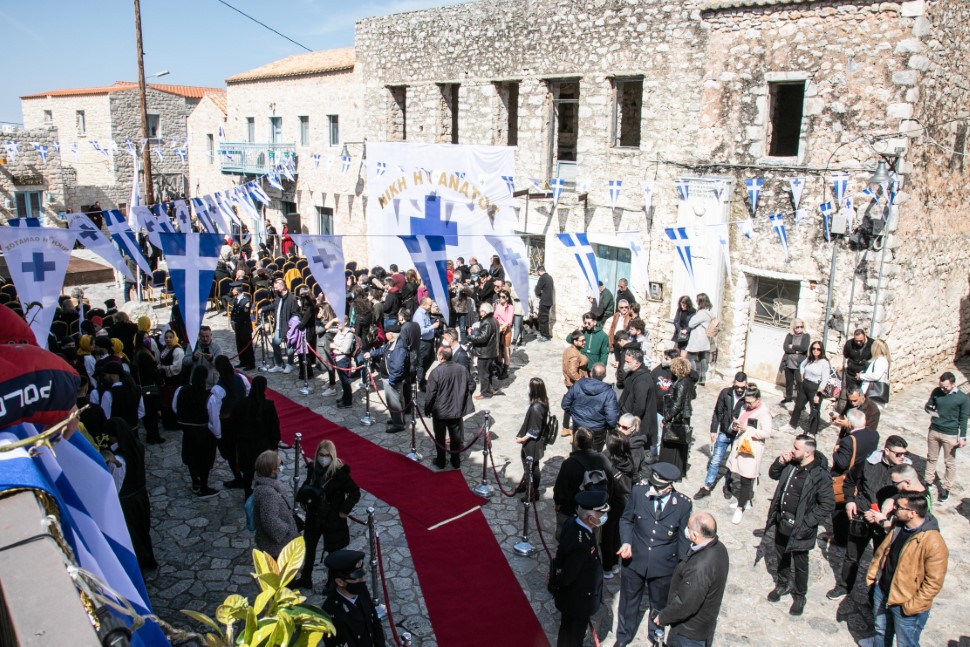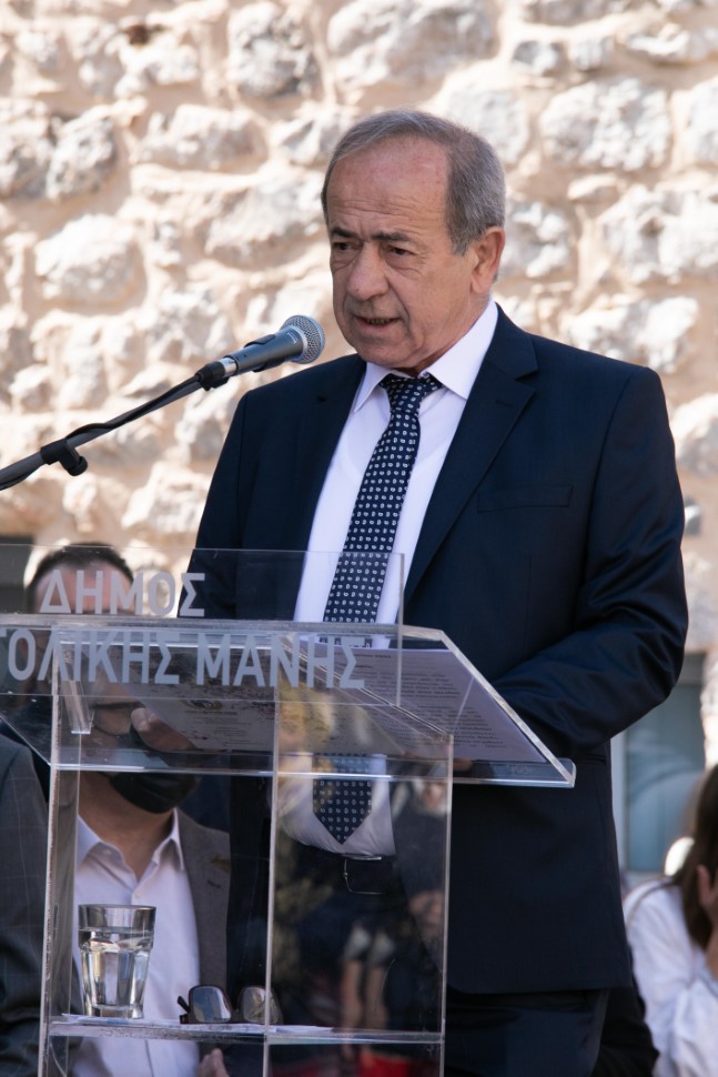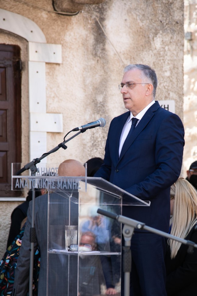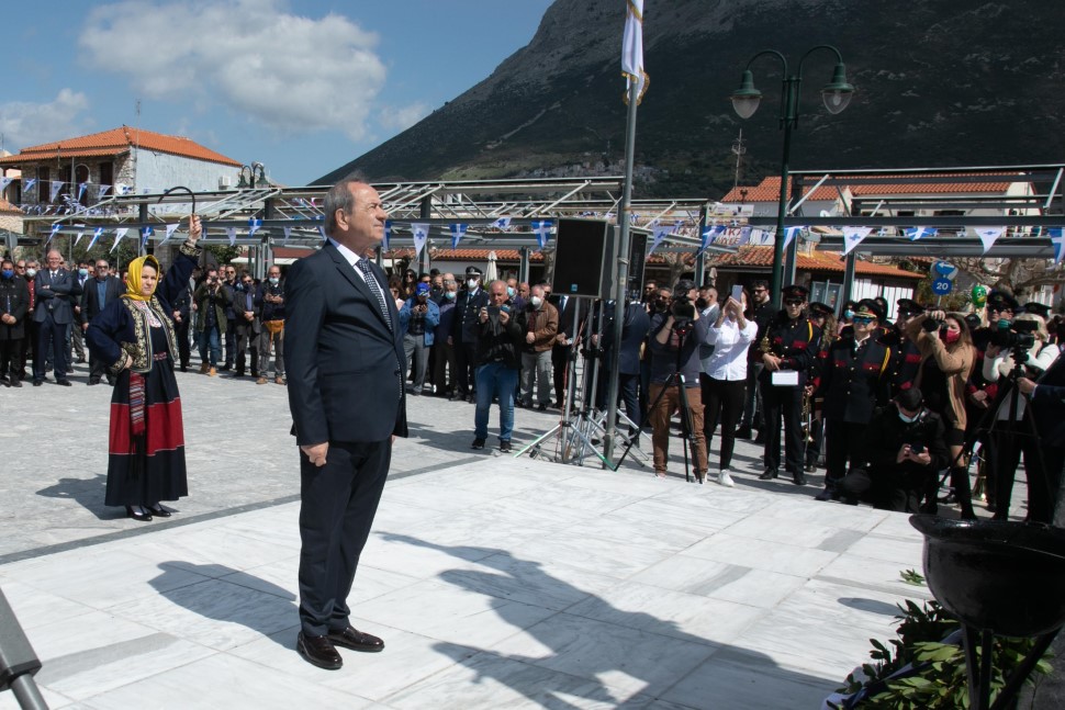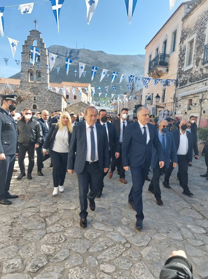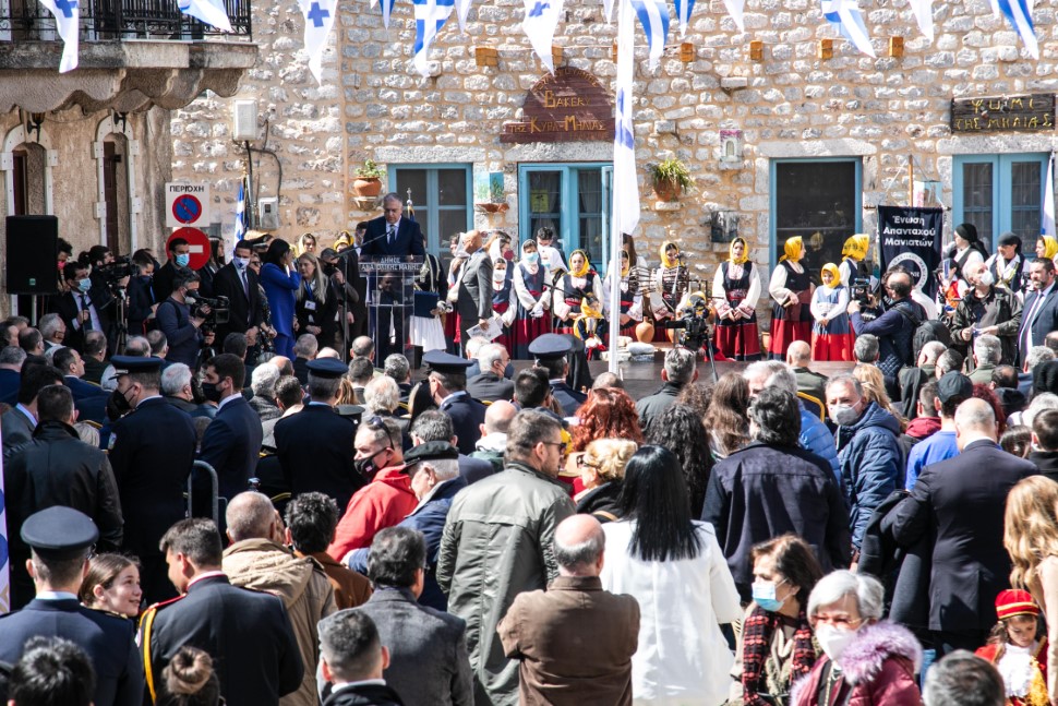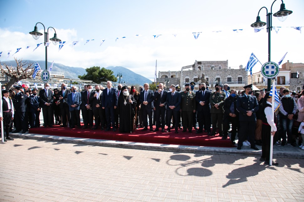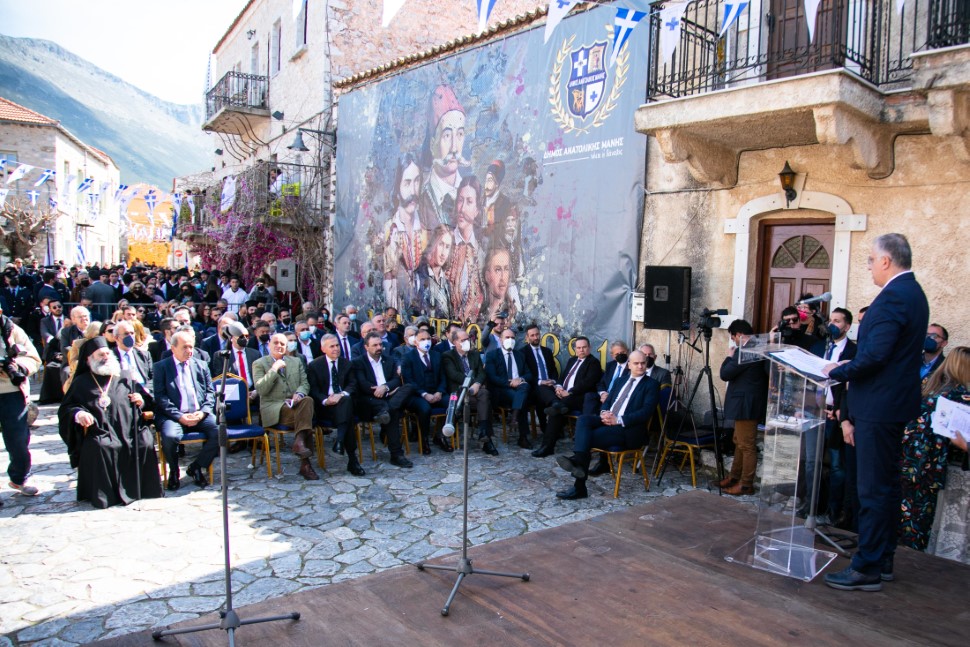 Από την πλευρά του ο υπουργός, ο οποίος εκπροσώπησε τον πρωθυπουργό και την κυβέρνηση στις εορταστικές εκδηλώσεις, στον χαιρετισμό του αναφέρθηκε στην ιστορική συμβολή της Μάνης, λέγοντας πως «201 χρόνια μετά, η ιδιαίτερη πατρίδα μας έχει την υπερηφάνεια του μπροστάρη, του μαχητή, του πρωταγωνιστή της ιστορίας αυτής της χώρας. Έτσι ήταν, αυτή είναι η ιστορική αλήθεια. Η Μάνη ήταν ο πρωταγωνιστής αυτής της ιστορίας. Η πατρίδα μας σήμερα έχει κατακτήσει οριστικά την ελευθερία της μέσα από αγώνες και αίμα. Η Ελλάδα πέρασε από χίλια κύματα. Περάσαμε πολύ δύσκολες περιόδους και σήμερα έχουμε τη δυνατότητα να τιμάμε το δοξασμένο παρελθόν, να κρατάμε τις παρακαταθήκες των εθνικών αγώνων και να τις χρησιμοποιούμε όπως πρέπει για να δημιουργήσουμε το μέλλον με σχέδιο και με πίστη στις δυνάμεις μας και με πίστη στις αξίες της ελευθερίας, της αλληλεγγύης, της ασφάλειας και του πατριωτισμού. Τέσσερις αξίες που ό,τι κι αν αλλάξει σε αυτόν τον κόσμο, οφείλουν να μας καθοδηγούν όλους για πάντα.» Αναφέρθηκε, επίσης, στο σήμερα λέγοντας πως «η χώρα βρίσκεται μπροστά σε νέες προκλήσεις, ζούμε σε έναν κόσμο αβεβαιότητας, εξαιτίας πολλαπλών απειλών που όλοι μας έχουμε βιώσει τα τελευταία χρόνια και μέχρι τις ημέρες μας, από την τεράστια υγειονομική κρίση σε όλη τη γη λόγω της πανδημίας μέχρι τον πόλεμο, που δυστυχώς έχει επανέλθει στην ευρωπαϊκή ήπειρο μέσα από μια παράνομη, παράλογη, επικίνδυνη εισβολή της Ρωσίας στην Ουκρανία.