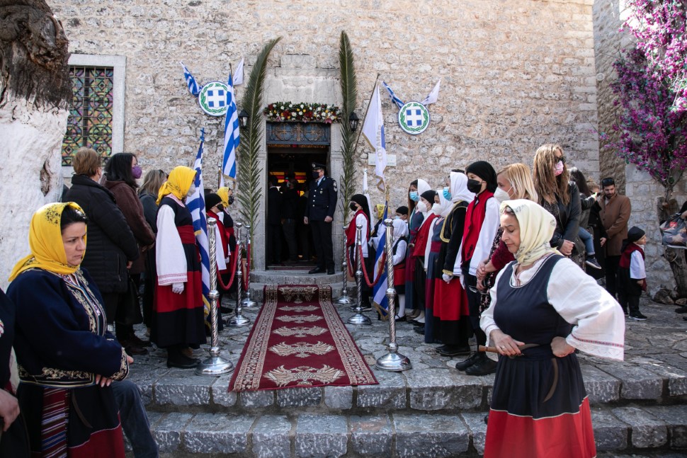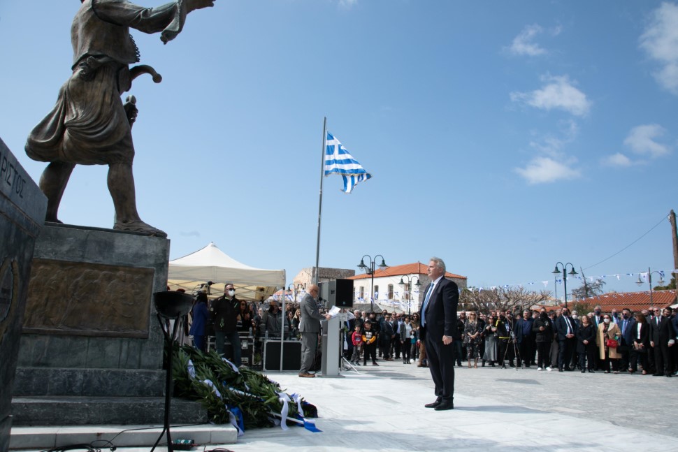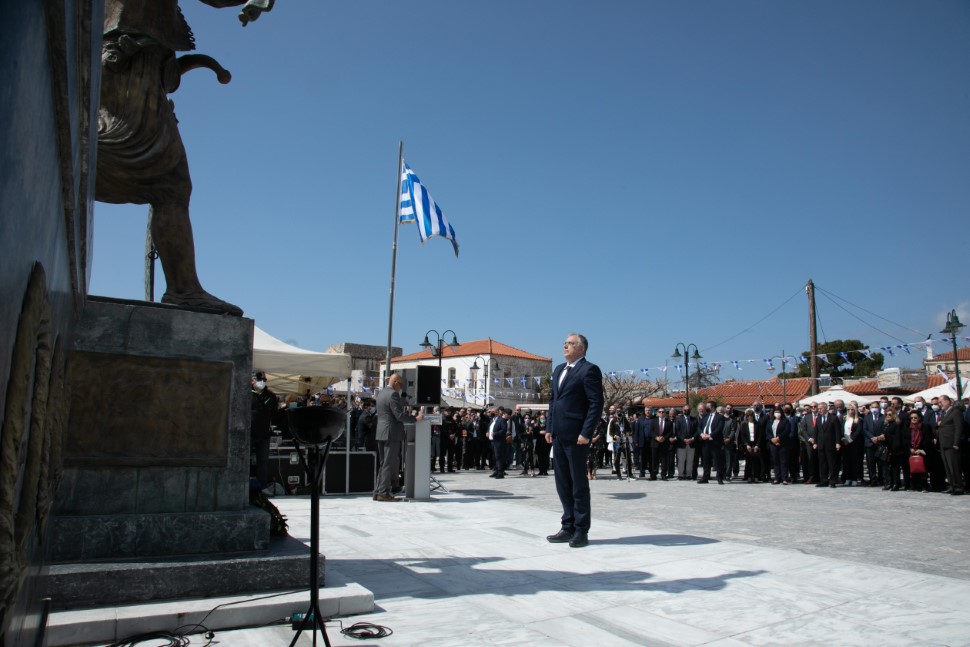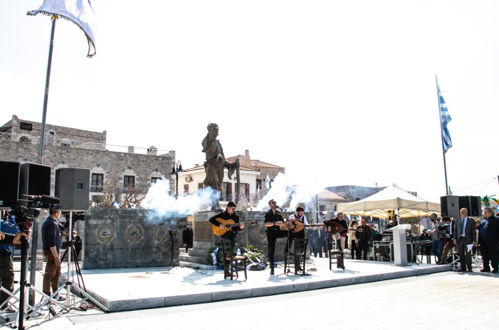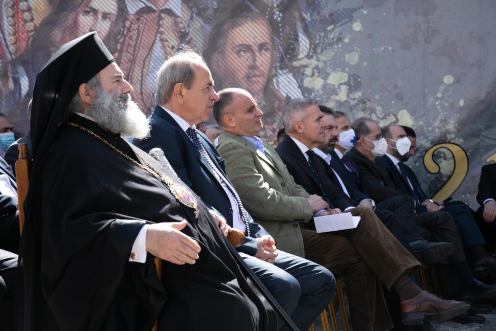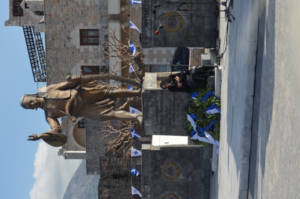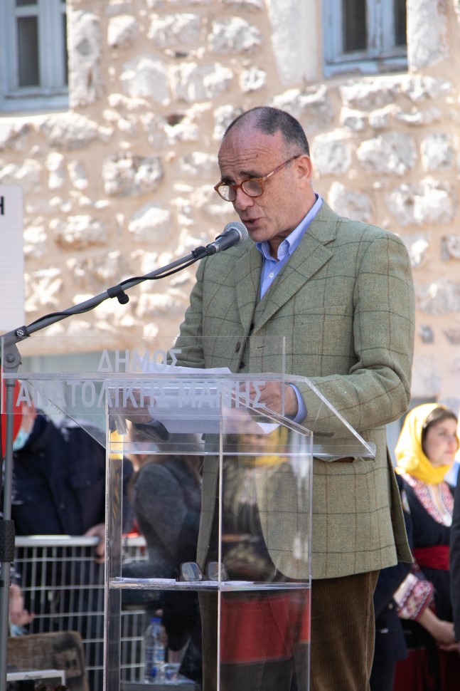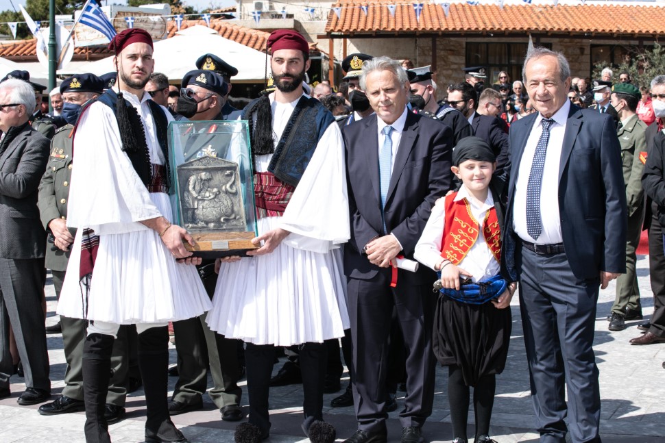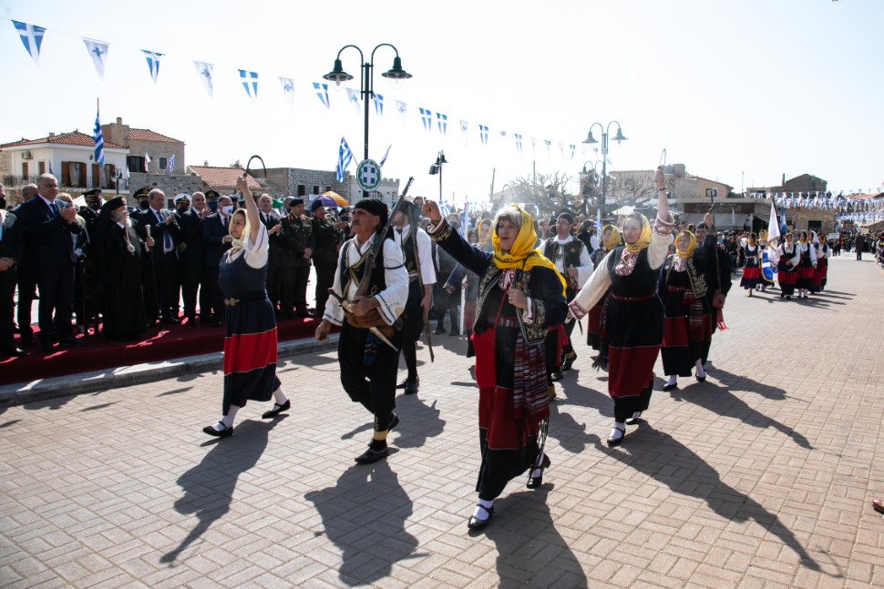 Από την πλευρά του ο υπουργός, ο οποίος εκπροσώπησε τον πρωθυπουργό και την κυβέρνηση στις εορταστικές εκδηλώσεις, στον χαιρετισμό του αναφέρθηκε στην ιστορική συμβολή της Μάνης, λέγοντας πως «201 χρόνια μετά, η ιδιαίτερη πατρίδα μας έχει την υπερηφάνεια του μπροστάρη, του μαχητή, του πρωταγωνιστή της ιστορίας αυτής της χώρας. Έτσι ήταν, αυτή είναι η ιστορική αλήθεια. Η Μάνη ήταν ο πρωταγωνιστής αυτής της ιστορίας. Η πατρίδα μας σήμερα έχει κατακτήσει οριστικά την ελευθερία της μέσα από αγώνες και αίμα. Η Ελλάδα πέρασε από χίλια κύματα. Περάσαμε πολύ δύσκολες περιόδους και σήμερα έχουμε τη δυνατότητα να τιμάμε το δοξασμένο παρελθόν, να κρατάμε τις παρακαταθήκες των εθνικών αγώνων και να τις χρησιμοποιούμε όπως πρέπει για να δημιουργήσουμε το μέλλον με σχέδιο και με πίστη στις δυνάμεις μας και με πίστη στις αξίες της ελευθερίας, της αλληλεγγύης, της ασφάλειας και του πατριωτισμού. Τέσσερις αξίες που ό,τι κι αν αλλάξει σε αυτόν τον κόσμο, οφείλουν να μας καθοδηγούν όλους για πάντα.» Αναφέρθηκε, επίσης, στο σήμερα λέγοντας πως «η χώρα βρίσκεται μπροστά σε νέες προκλήσεις, ζούμε σε έναν κόσμο αβεβαιότητας, εξαιτίας πολλαπλών απειλών που όλοι μας έχουμε βιώσει τα τελευταία χρόνια και μέχρι τις ημέρες μας, από την τεράστια υγειονομική κρίση σε όλη τη γη λόγω της πανδημίας μέχρι τον πόλεμο, που δυστυχώς έχει επανέλθει στην ευρωπαϊκή ήπειρο μέσα από μια παράνομη, παράλογη, επικίνδυνη εισβολή της Ρωσίας στην Ουκρανία.