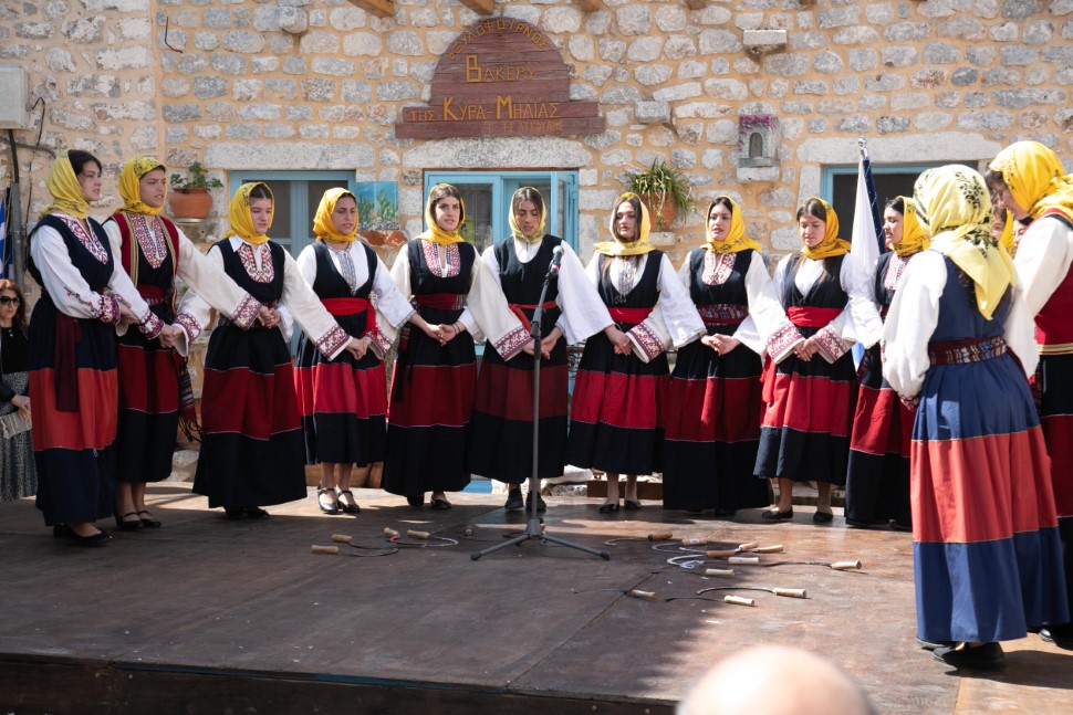 Εκεί έγινε αναπαράσταση της ορκωμοσίας των μανιάτικων οικογενειών κι ακολούθησε η εκδήλωση με τίτλο «Το συναπάντημα δύο Δημοτικών Σχολείων μέσα από την ιστορία του τόπου μας». Οι μαθητές του Δημοτικού Σχολείου Αρεόπολης υποδέχθηκαν εκείνους του Δημοτικού Σχολείου Λιβαδίων Ρεθύμνου. Τα παιδιά των δύο σχολείων παρουσίασαν βίντεο που είχαν ετοιμάσει σχετικά με τη γιορτή της 17ης Μαρτίου και στη συνέχεια παρουσίασαν από κοινού χορούς από τη Μάνη και την Κρήτη.