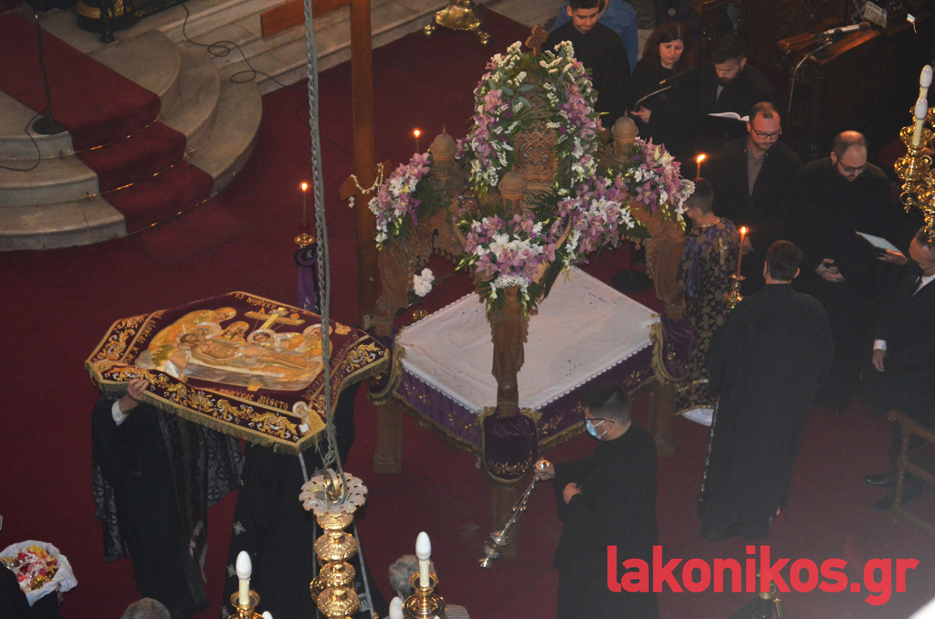 Σε έντονα συγκινησιακό κλίμα τελέσθηκαν το πρωί της Μ. Παρασκευής (22/4), στον Ιερό Ναό Οσίου Νίκωνος Σπάρτης, η ακολουθία των Μεγάλων Ωρών και ο εσπερινός της Αποκαθηλώσεως, χοροστατούντος του σεβασμιωτάτου Μητροπολίτη κ. Ευσταθίου.