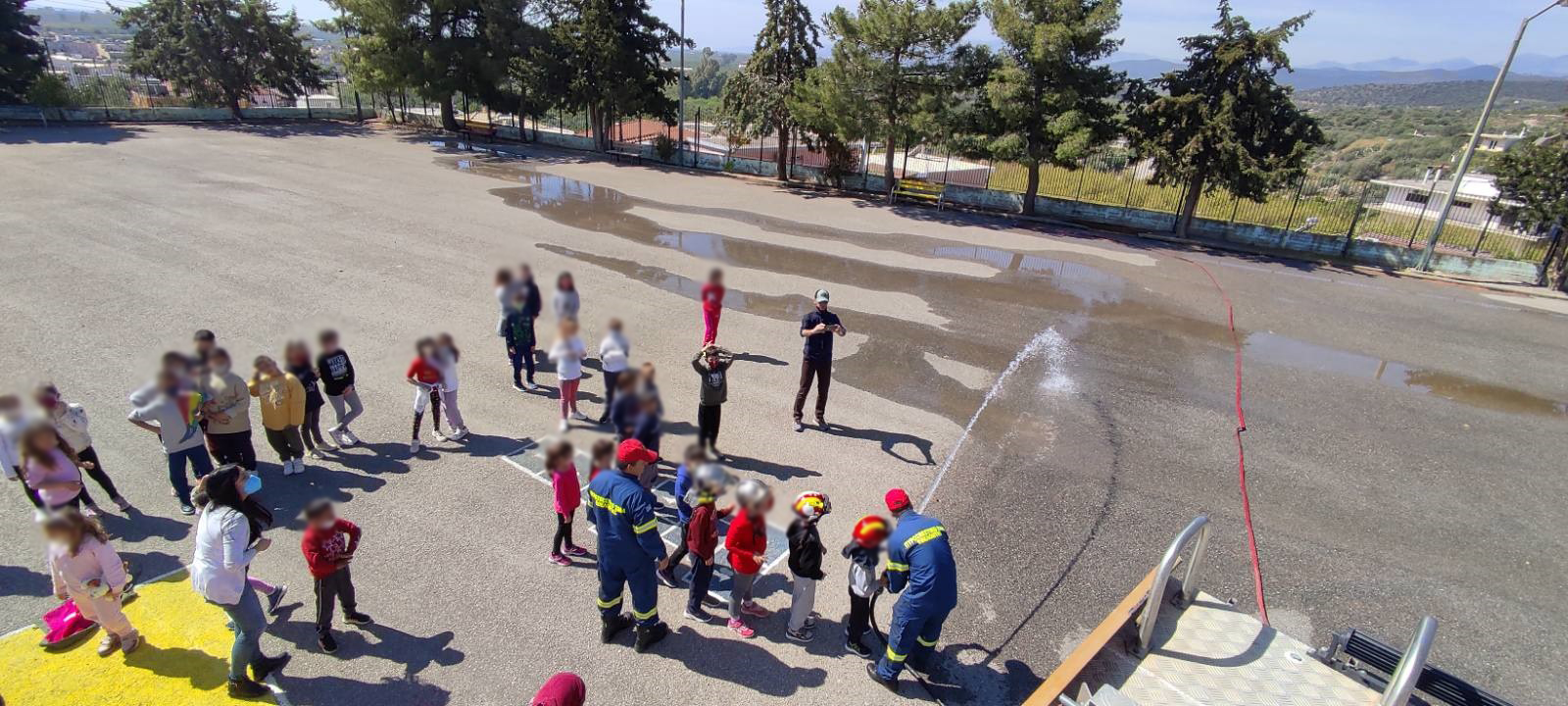 Στο διαδραστικό μέρος της ενημέρωσης όλοι οι μαθητές, αφού ενημερώθηκαν για τα υλικά και τα εξαρτήματα του πυροσβεστικού οχήματος, με την βοήθεια του πληρώματος του Π.Ο. ανέπτυξαν εγκατάσταση νερού χαμηλής πίεσης και έριξαν νερό.