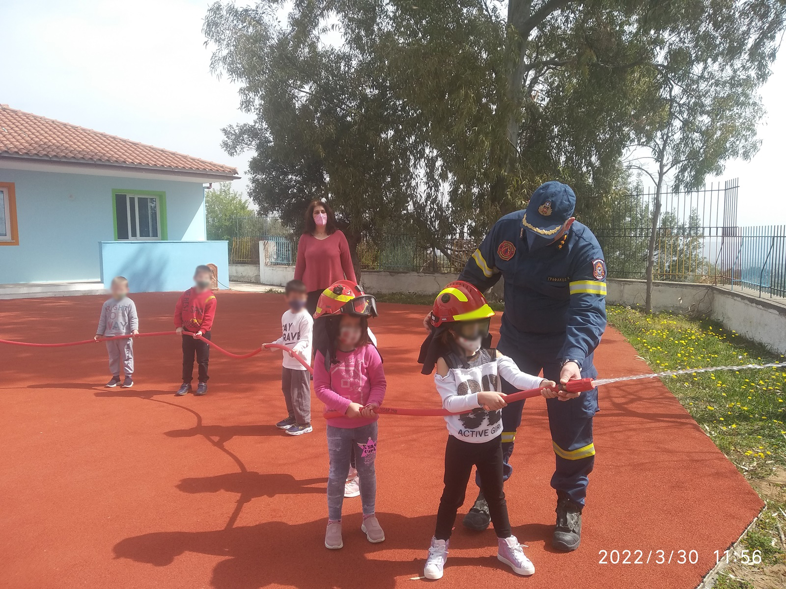 Στα νηπιαγωγεία η δράση πραγματοποιήθηκε κατόπιν πρόσκλησης των νηπιαγωγών και περιείχε οπτικοακουστικό υλικό με υλικά και μέσα του Πυροσβεστικού Σώματος, περιγραφές του πυροσβεστικού οχήματος, πληροφορίες για την πρόληψη στο σπίτι με αφορμές για σχετικές συζητήσεις των παιδιών με τους γονείς τους. Εντύπωση και ενθουσιασμό προκάλεσε η περιγραφή μικρής ιστορίας από την συμμετοχή του εκπαιδευτή και την εξέλιξη συμβάντος πυρκαγιάς.