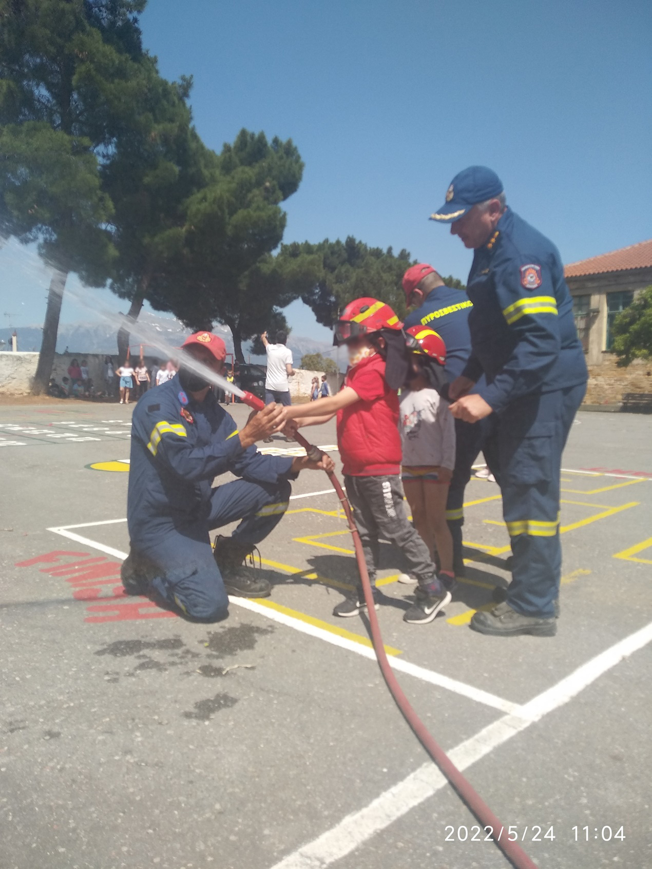 Τέλος, οι μαθητές ξεναγήθηκαν στα μέρη του πυροσβεστικού οχήματος και αισθάνθηκαν με ενθουσιασμό για λίγο ως «ήρωες πυροσβέστες» κρατώντας τον πυροσβεστικό αυλό.