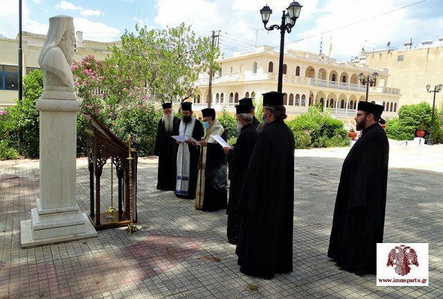 Παράλληλα, ο σεβασμιώτατος, συνοδευόμενος από τον πρωτοσύγκελλο της Ιεράς Μητρόπολης Μονεμβασίας και Σπάρτης, πανοσ. αρχ. Θεόφιλο Μαντζαβράκο και άλλους κληρικούς της τοπικής Εκκλησίας, τέλεσε –εμφανώς συγκινημένος– δέηση στην προτομή του Αγίου, έμπροσθεν της ιερής εικόνας του στον προαύλιο χώρο του Μητροπολιτικού Ναού Ευαγγελιστρίας Σπάρτης.