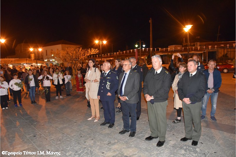Μεταξύ αυτών παρέστησαν ο αντιπεριφερειάρχης Λακωνίας κ. Τζινιέρης, οι αντιδήμαρχοι του Δήμου Ανατολικής Μάνης κκ Δρακουλάκου, Εξαρχάκος και Κουμεντάκος, ο ανώτατος στρατιωτικός διοικητής Λακωνίας-διοικητής ΚΕΕΜ, Ταξίαρχος κ. Πολίτης, ο Αστυνομικός Διευθυντής Λακωνίας κ. Τσιγαρίδης, ο υποδιοικητής ΠΥ Αρεόπολης, Πυραγός κ. Καρατζής, ο διοικητής ΑΤ Αρεόπολης, Υπαστυνόμος Ά, κ. Μπουρδάκος, αλλά και άλλοι εκπρόσωποι τοπικών αρχών και φορέων.