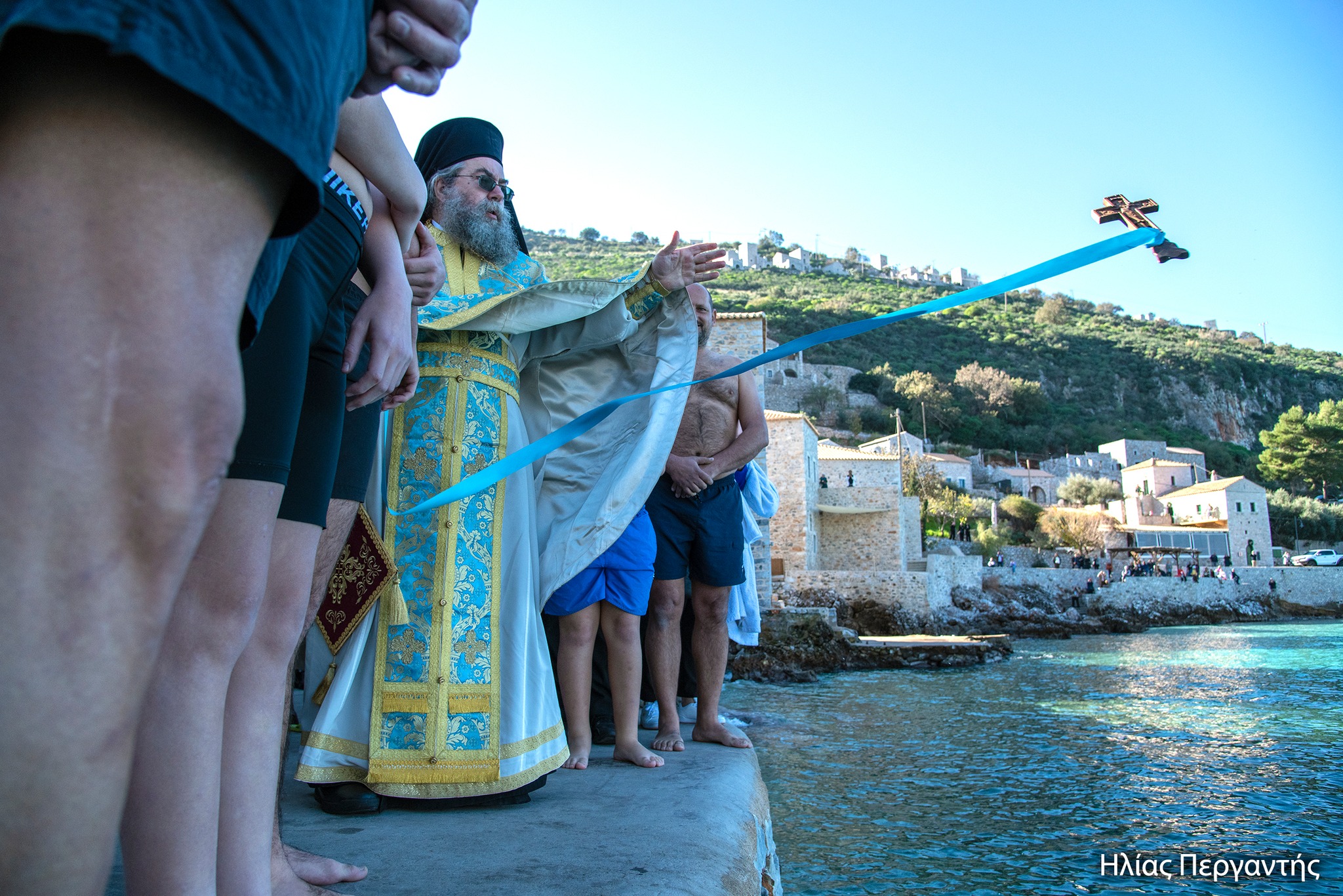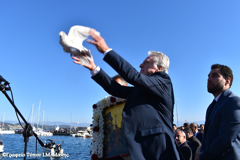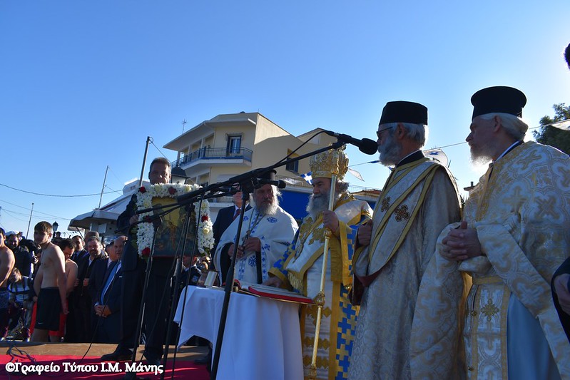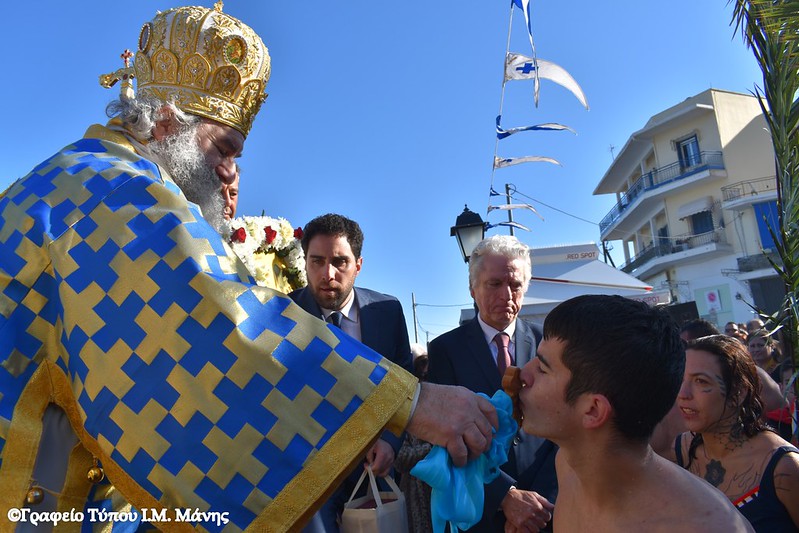 Στη συνέχεια σχηματίστηκε λιτανευτική πομπή που, υπό τους ήχους της Φιλαρμονικής του Δήμου Ανατολικής Μάνης, κατευθύνθηκε προς την αποβάθρα του λιμένα, όπου πραγματοποιήθηκε η κατάδυση του Τιμίου Σταυρού και ο καθαγιασμός των υδάτων. Στη θάλασσα βούτηξαν 14 κολυμβητές, γεμάτοι πίστη και ενθουσιασμό που έλαβαν την ευλογία του Σταυρού από τα χέρια του Μητροπολίτη Χρυσοστόμου Γ’. Τον Τίμιο Σταυρό ανέσυρε ο νέος αγρότης, που υπηρετεί αυτή την περίοδο τη στρατιωτική του θητεία, Παναγιώτης Μαστοράκος.