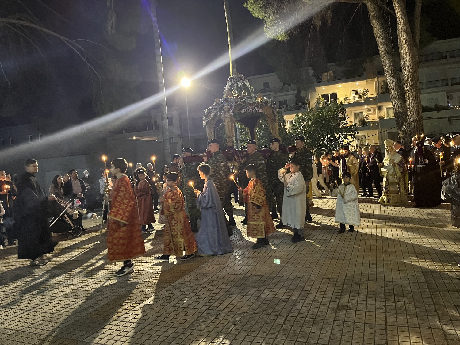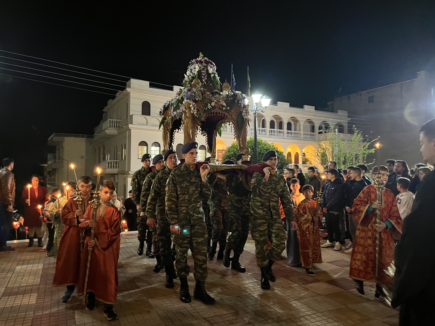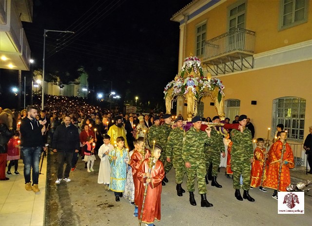 Στη συνέχεια, σε κατανυκτικό κλίμα, ξεκίνησε η περιφορά του Επιταφίου σε κεντρικούς δρόμους της Σπάρτης, προπορευομένης της Φιλαρμονικής του Δ. Σπάρτης, ενώ όπως κάθε χρόνο συνόδευε τιμητικό άγημα του Στρατού.
