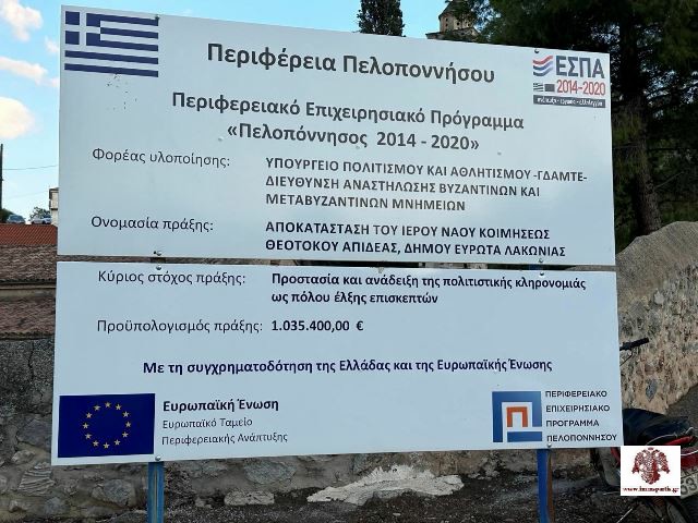 Με εκκλησιαστική μεγαλοπρέπεια πραγματοποιήθηκαν το απόγευμα της Κυριακής 13 Αυγούστου τα θυρανοίξια του ιστορικού παλαιοχριστιανικού Ιερού Ναού Κοιμήσεως της Θεοτόκου στην Απιδέα Δ. Ευρώτα. Η τελετή έλαβε χώρα προεξάρχοντος του σεβασμιωτάτου Μητροπολίτη Μονεμβασίας και Σπάρτης κ. Ευσταθίου, της υπουργού Πολιτισμού, Λίνας Μενδώνη, του υπουργού Επικρατείας, Μάκη Βορίδη, εκπροσώπων των τοπικών αρχών και πλήθους κόσμου.