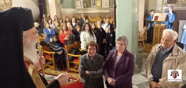 Με την ολοκλήρωση της εσπερινής λατρευτικής σύναξης, ο ποιμενάρχης πρόσφερε από μία εικόνα, ως ευλογία, στον κ. Λάζαρο Νοχό, ο οποίος διακονεί την Ενορία, για περισσότερα από σαράντα χρόνια, από την θέση του Επιτρόπου, καθώς και στις κυρίες Αντωνία Βουλουμάνου και Ειρήνη Γρίβα, οι οποίες για πενήντα περίπου έτη προσφέρουν τις πολύτιμες υπηρεσίες τους από το αναλόγιο του ναού.