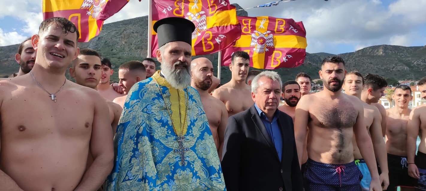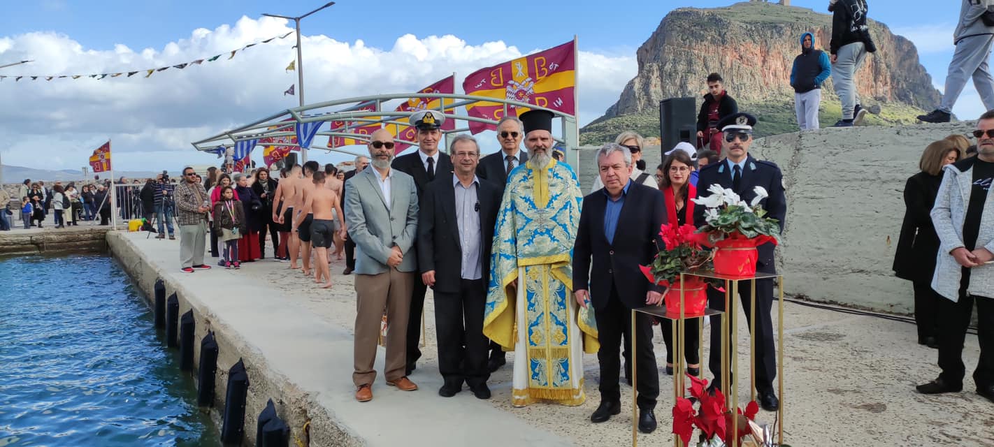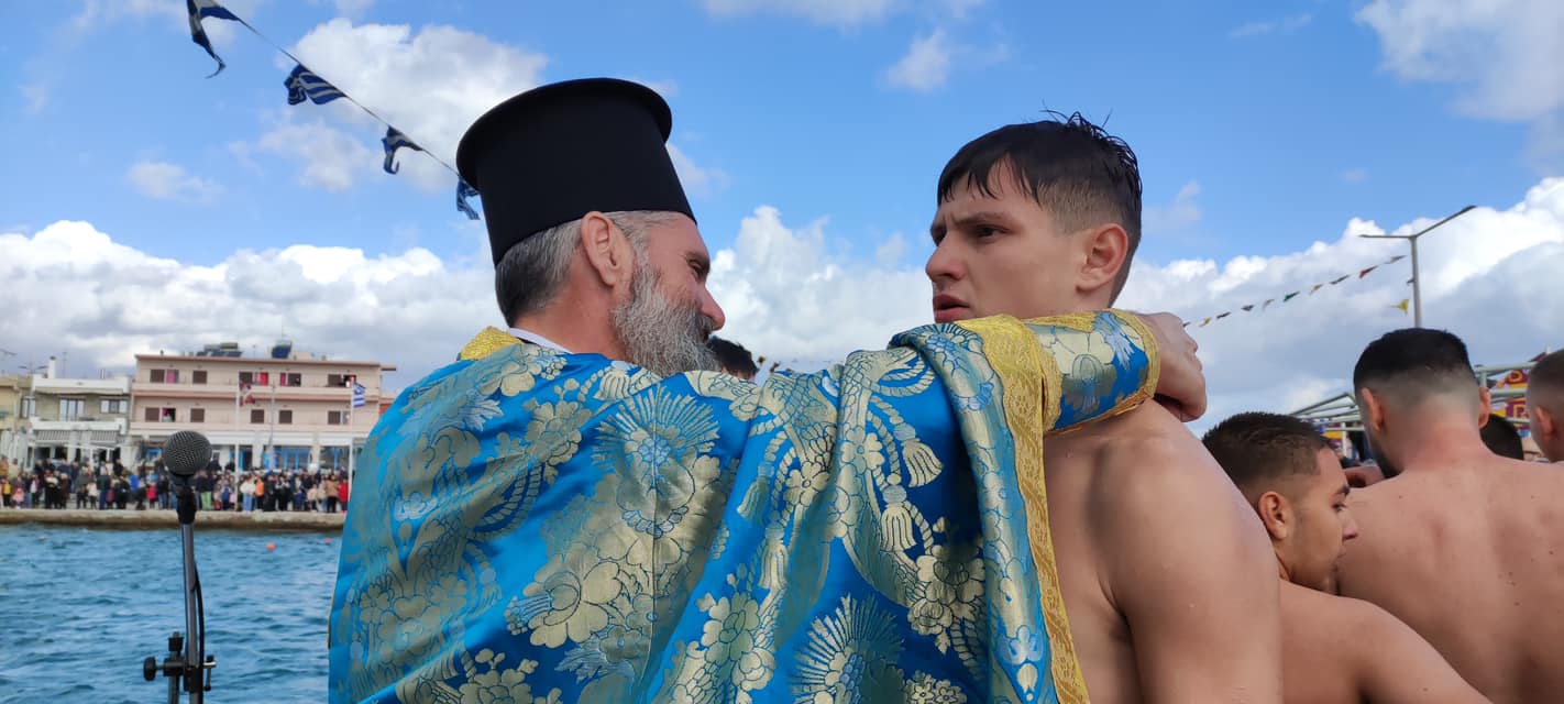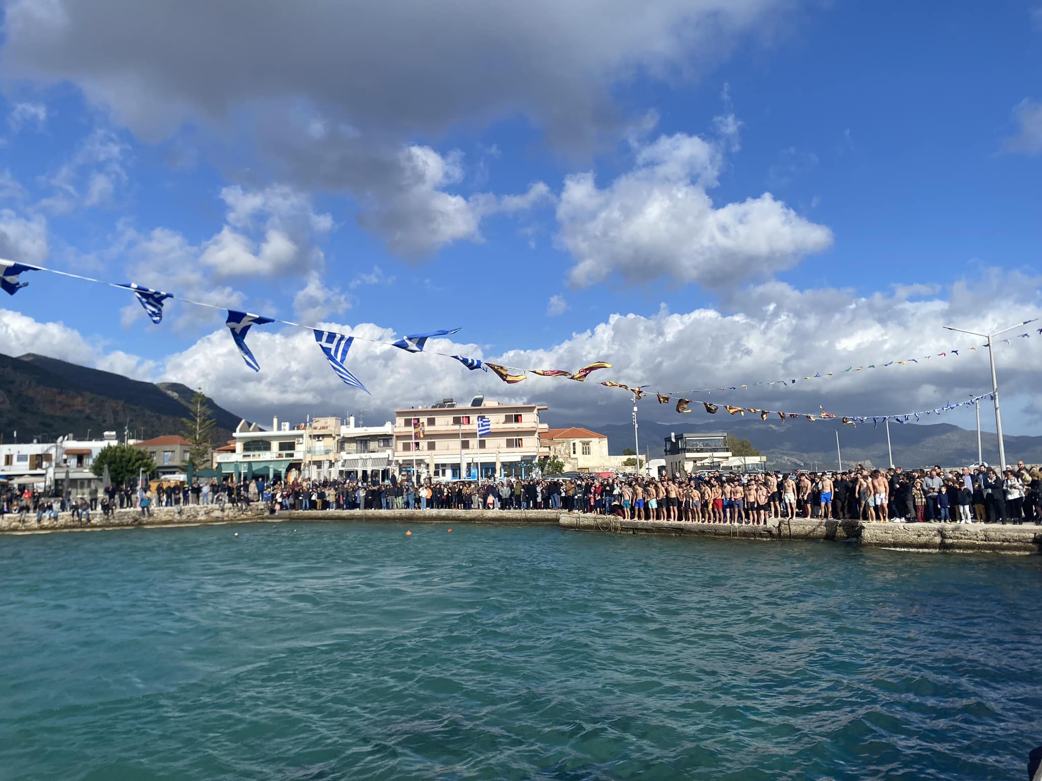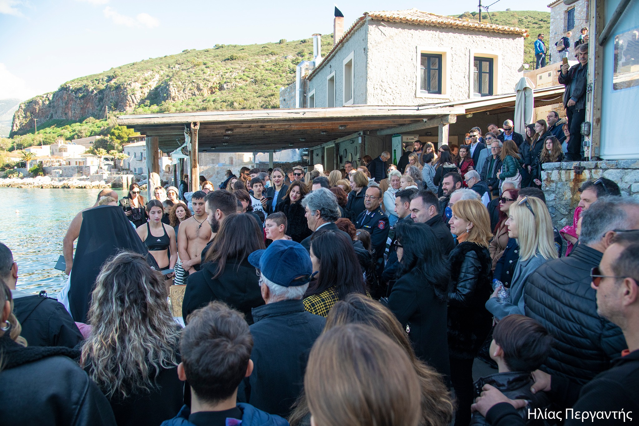 Ακολούθως, τελέσθηκε ο αγιασμός των υδάτων στο λιμάνι της λακωνικής κωμόπολης. Αρκετοί ήταν οι θαρραλέοι νέοι της περιοχής που έπεσαν στη θάλασσα για να ανασύρουν τον Σταυρό και να δεχθούν την ευλογία Του.