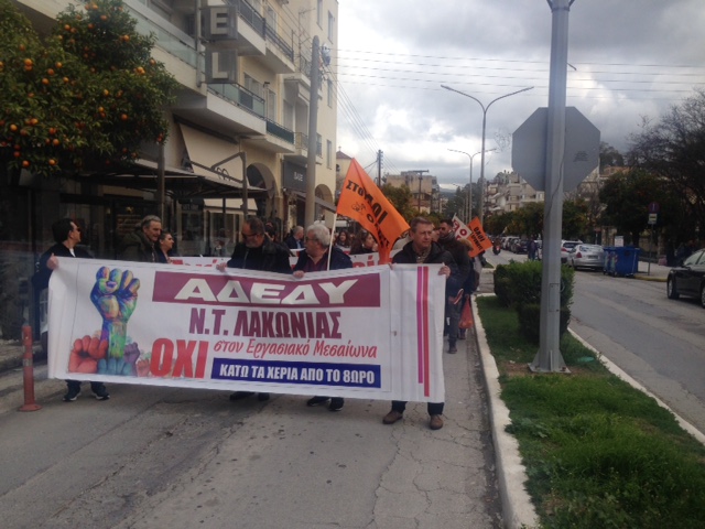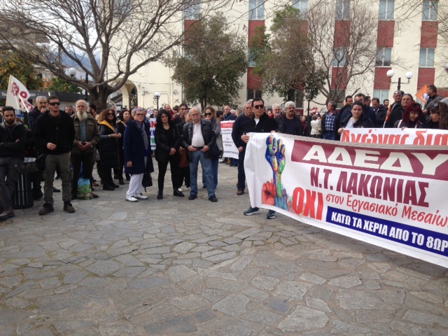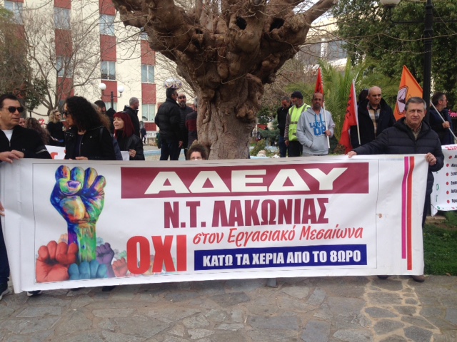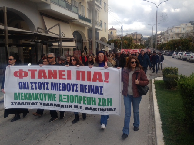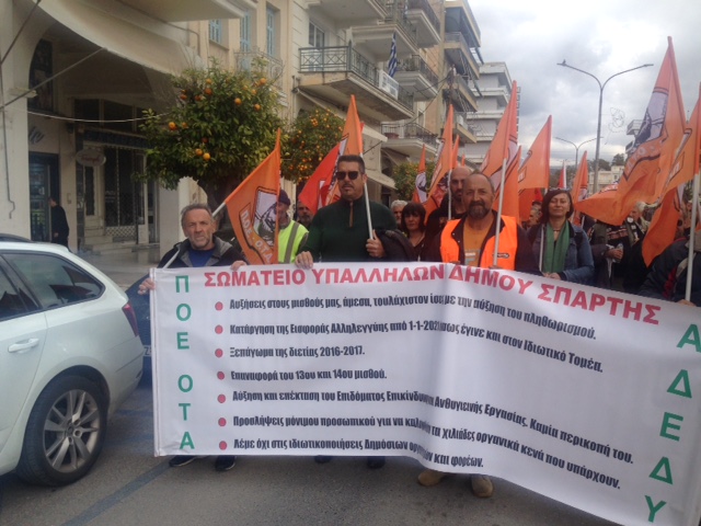 Φορώντας ένα κατακόκκινο αστέρι στο αριστερό πέτο, μίλησε ο επικεφαλής της ΑΔΕΔΥ Λακωνίας, Παναγ. Κουμουνδούρος. Μνημονεύετε Ρόζα Λούξεμπουργκ! Έθεσε τα επίδικα της απεργίας για την ΑΔΕΔΥ. Η ακρίβεια «θερίζει» τον κοσμάκη. Διεκδικεί «να δοθεί πίσω ο 13ος και ο 14ος μισθός, να καταργηθεί το χαράτσι της εισφοράς αλληλεγγύης, να προσμετρηθεί στη μισθολογική εξέλιξη η προϋπηρεσία της διετίας 2016 -17, να αυξηθεί και να επεκταθεί το επίδομα επικίνδυνης κι ανθυγιεινής εργασίας, να αυξηθεί το αφορολόγητο στις 12.000 ευρώ. Να στελεχωθούν άμεσα με μόνιμους υπαλλήλους όλοι οι κρίσιμοι δημόσιοι φορείς (υγεία, παιδεία, κοινωνικές υπηρεσίες, ασφάλιση κ.α) και να φτιαχτούν όλες οι αναγκαίες υποδομές».