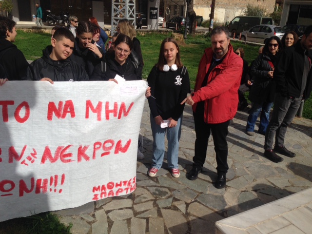 Δίπλα στους φοιτητές στάθηκαν δάσκαλοι και καθηγητές της πρωτοβάθμιας και δευτεροβάθμιας εκπαίδευσης Λακωνίας. «Να μην υπάρξει συγκάλυψη για το “έγκλημα” των Τεμπών», ζήτησε η Ευαγγελία, εκπρόσωπος των φοιτητικών συλλόγων από τα Τμήματα του Παν/μίου Σπάρτης.