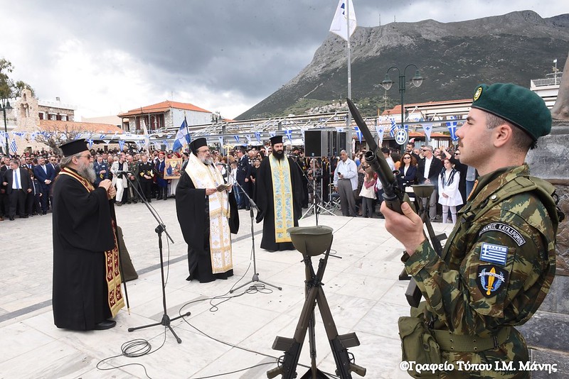 Στον χαιρετισμό του ο Μητροπολίτης Μάνης κ. Χρυσόστομος Γ΄, μεταξύ άλλων, ανέφερε: «Εορτάζουμε σήμερα 17 Μαρτίου την Επέτειο της ενάρξεως της Ελληνικής Επαναστάσεως από εδώ την Μάνη, από τούτο τον τόπο όπου βρισκόμεθα την ιστορική Αρεόπολη. Πέρασαν 203 χρόνια από τη σημαντική ημέρα της 17ης Μαρτίου 1821. Και σήμερα τιμούμε τους ήρωες, τους αγωνιστές. Εθνική ευγνωμοσύνη, λοιπόν, σ’ όλους αυτούς που αγωνίστηκαν και θυσιάστηκαν ενδόξως.