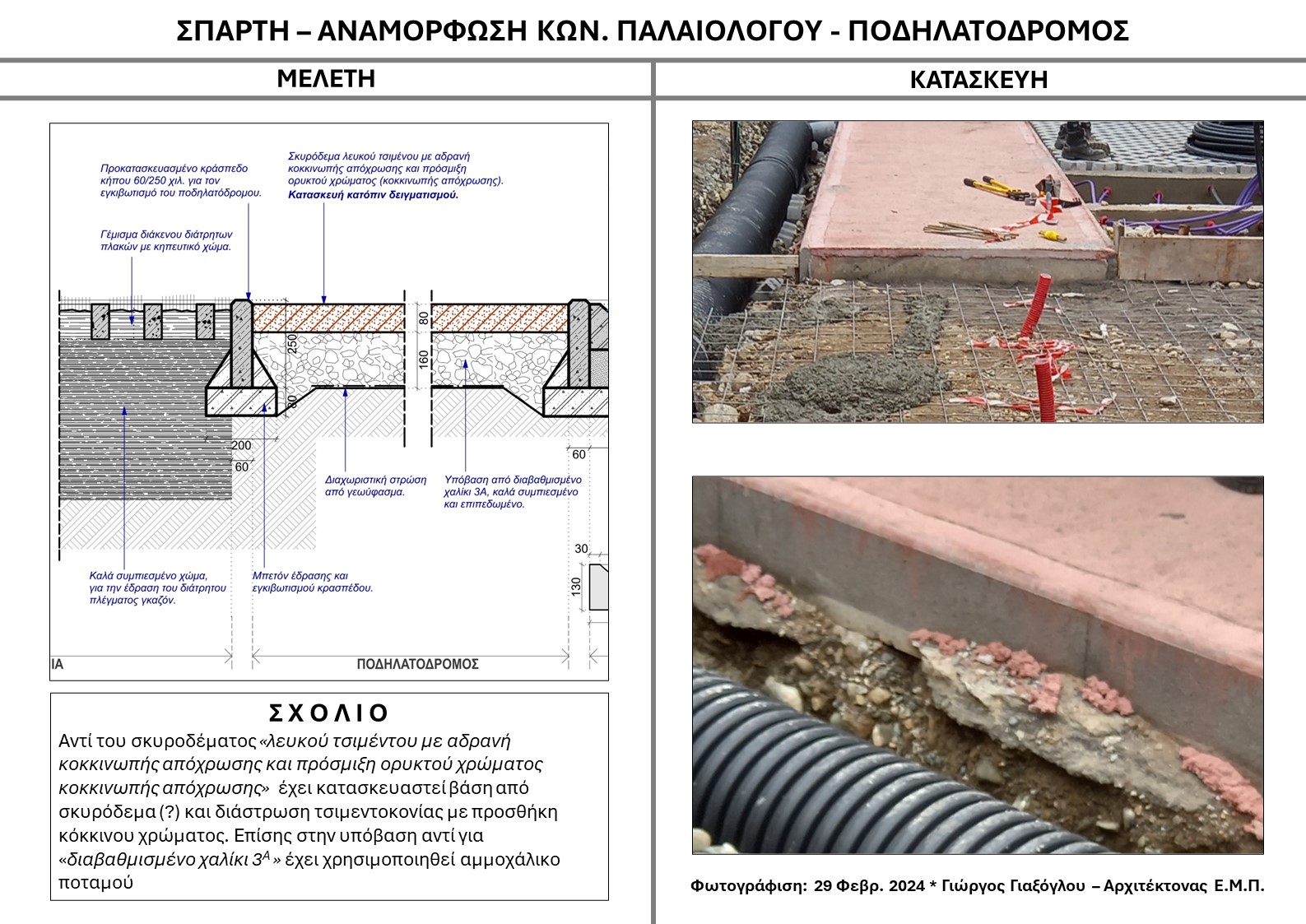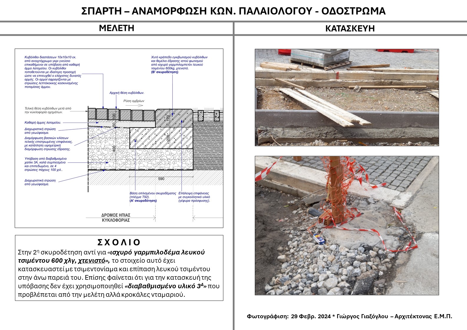 Για την κατασκευή των λωρίδων εγκιβωτισμού των κυβολίθων στα σχέδια λεπτομερειών αλλά και στα λοιπά Τεύχη της εγκεκριμένης μελέτης αναφέρεται ότι “η κατασκευή στην 2η σκυροδέτηση”, θα γίνει με “σχυρό γαρμπιλοδέμα λευκού τσιμέντου 600 χλγ, χτενιστό”. Αντ’ αυτού, το στοιχείο αυτό έχει κατασκευαστεί με τσιμεντοκονίαμα και επίπαση λευκού τσιμέντου στην άνω παρειά του. Επίσης φαίνεται ότι για την κατασκευή της υπόβασης, έξω από το οδόστρωμα δεν έχει χρησιμοποιηθεί “διαβαθμισμένο υλικό 3Α”, που προβλέπεται από την μελέτη αλλά κροκάλες νταμαριού.